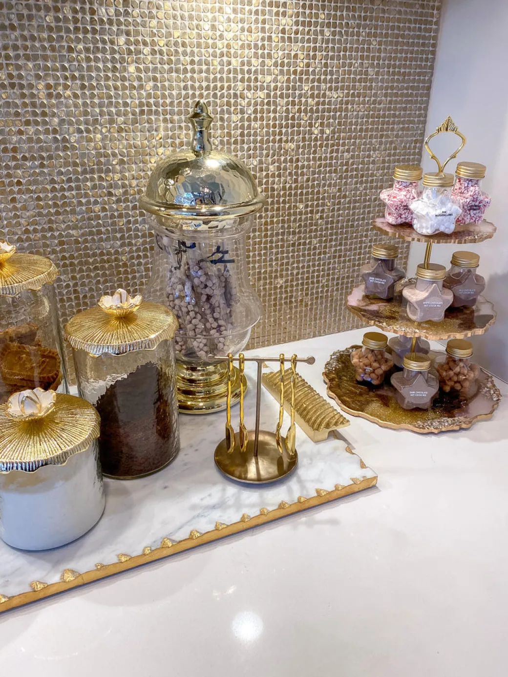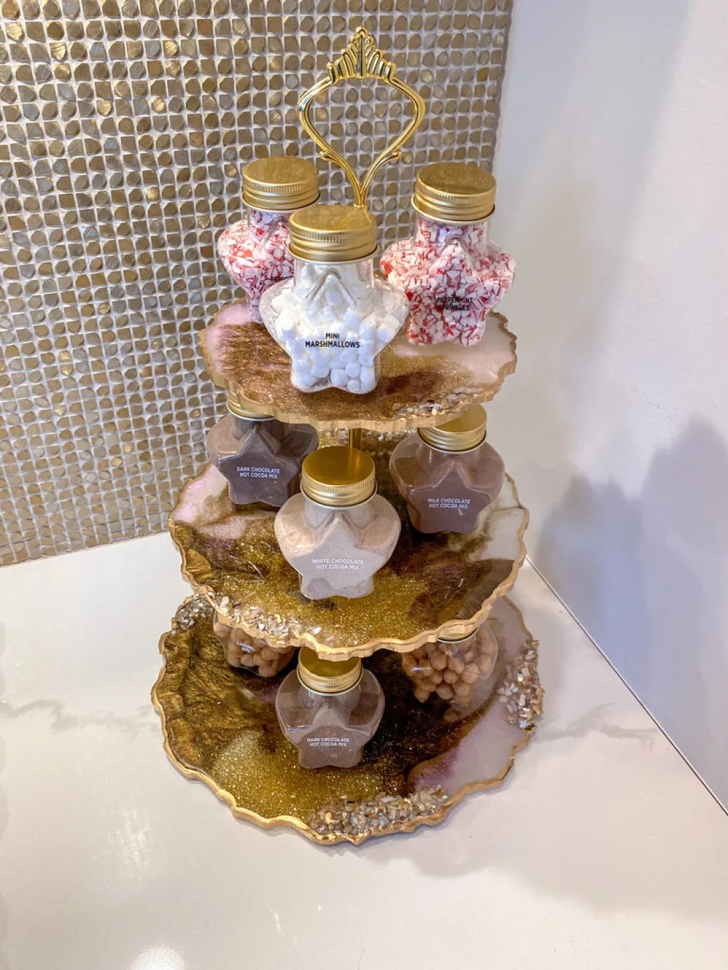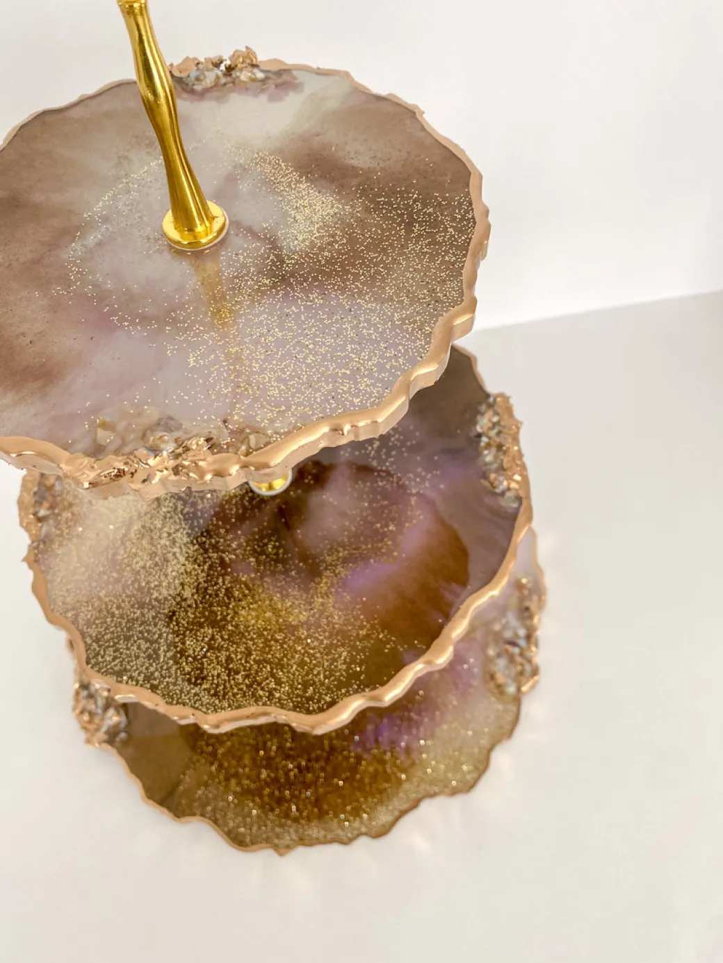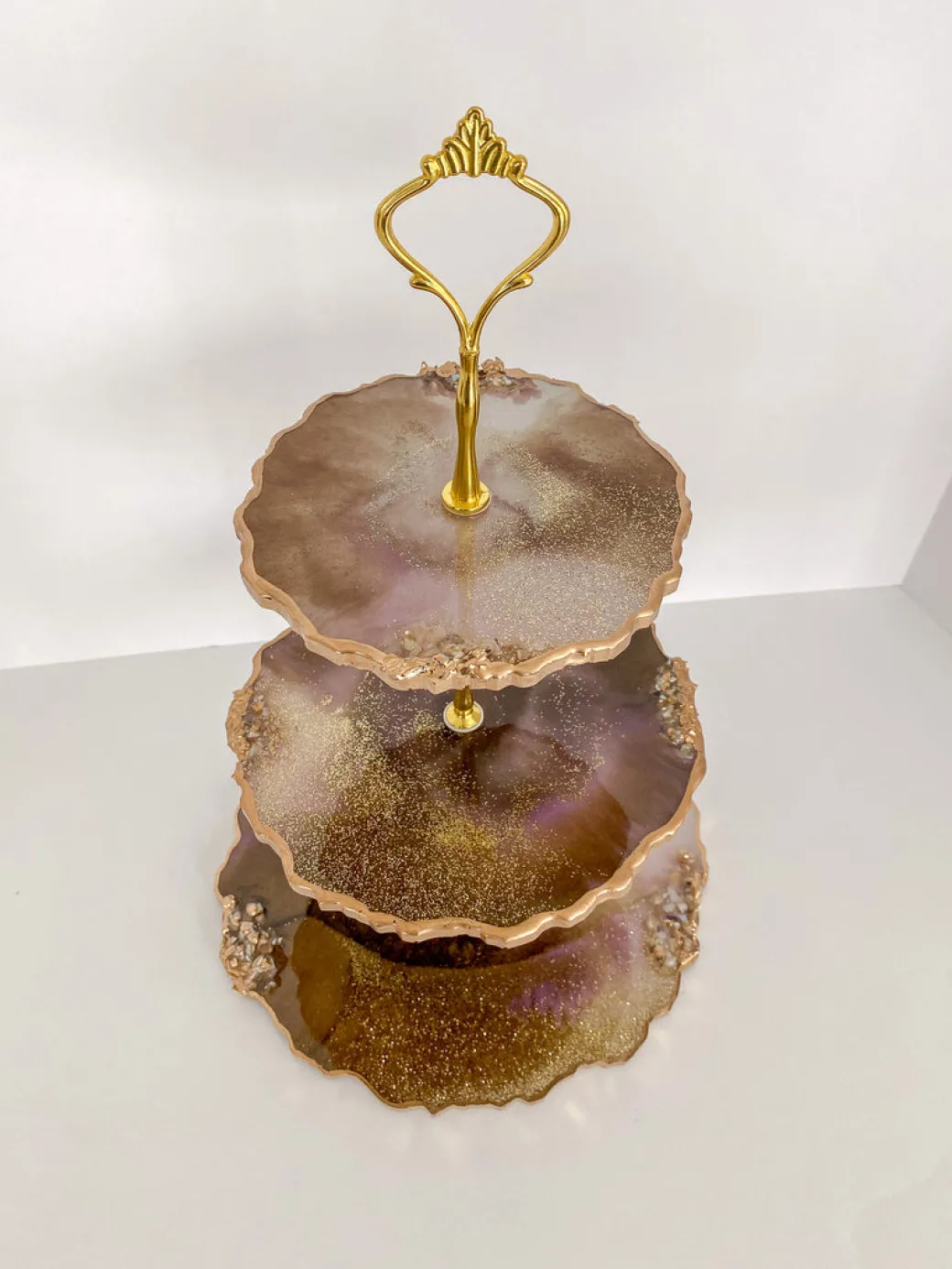 Description: This beautiful cake stand will add unique elegance to your serving display! Each piece is handmade with a glossy resin finish featuring gold and mauve colors, and encrusted with gold colored stones. Complete with three full tiers and gold colored hardware, this is the unique luxury you need!