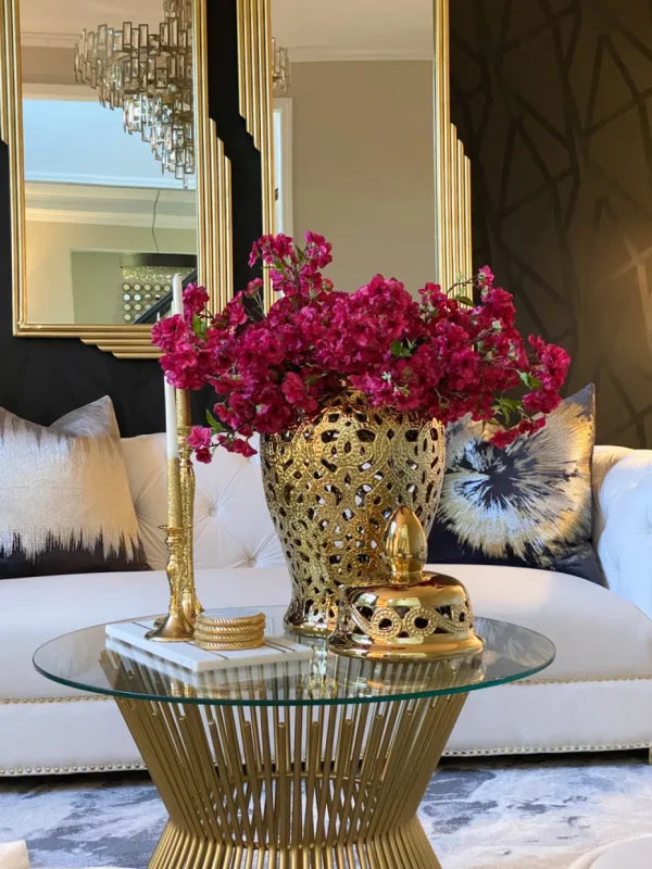 Description: This gold cut-out ceramic ginger jar is perfect for any decor!