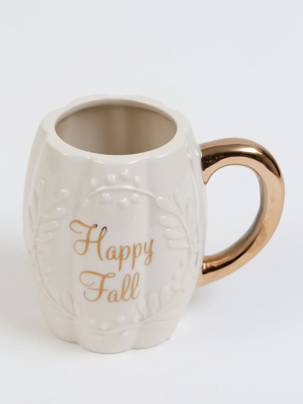 Description: This adorably elegant mug is perfect for fall! We love the glossy gold script and handle, combined with the stunning raised details and pumpkin-shaped design. Happy fall everyone!