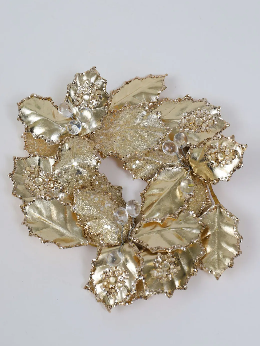 Description: This gold holly leaf candle ring is a must for holiday decor! This fits a 4” candle and will add the perfect touch to space!