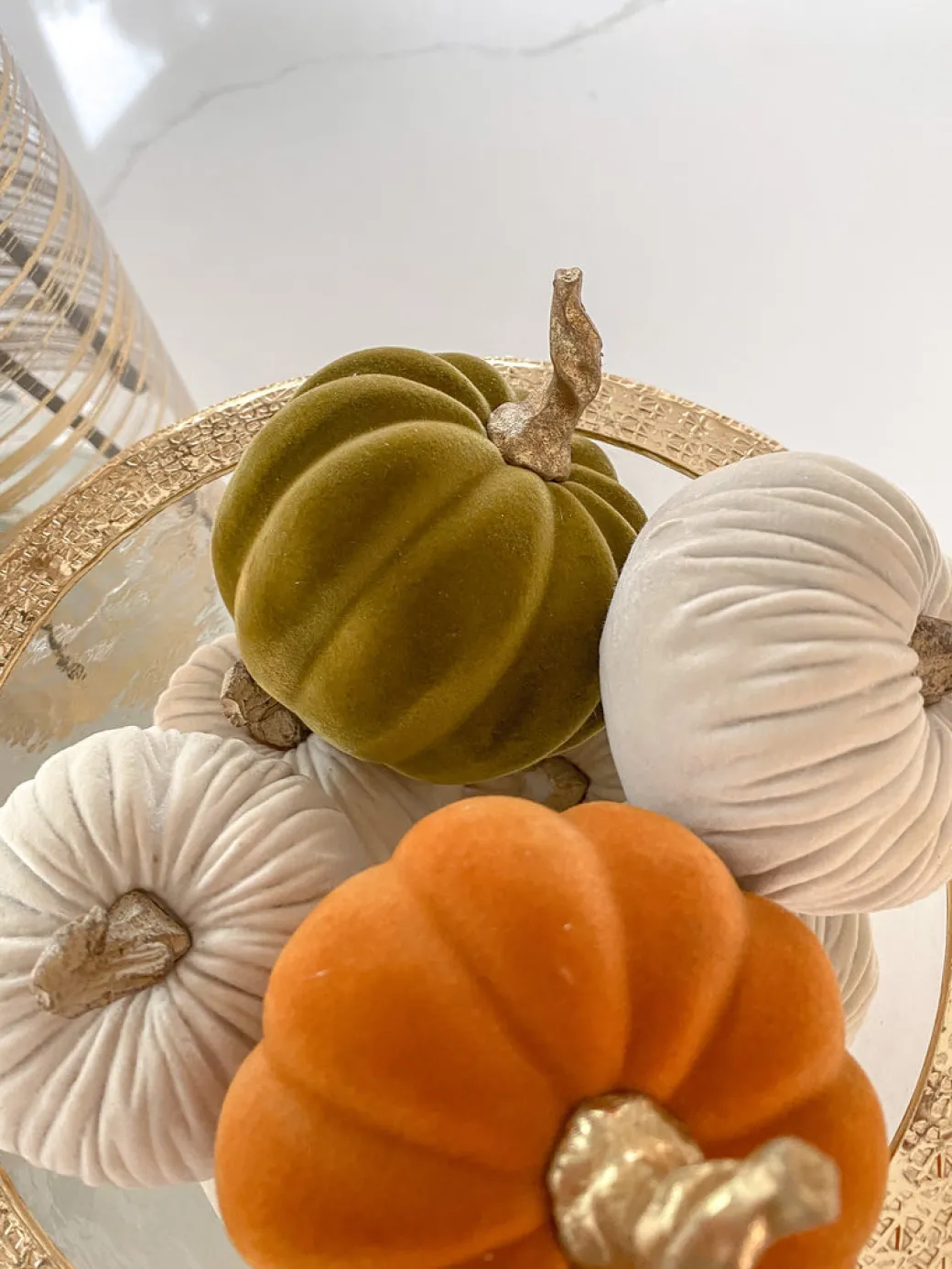 Description: This small green velvet pumpkin adds a pop of glamour to your fall decor! We love the gold stem!