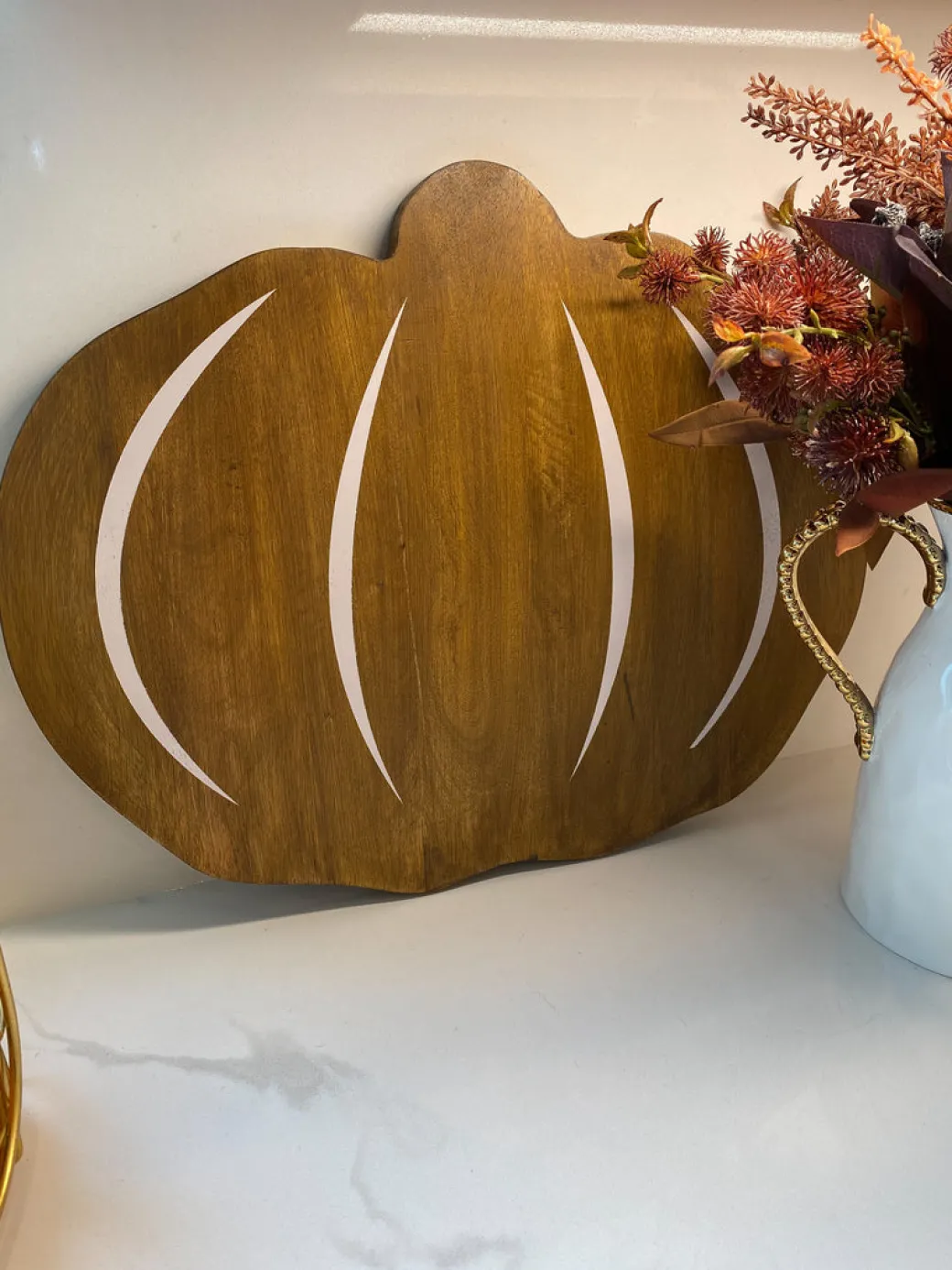 Description: This beautiful pumpkin tray is the perfect base for your fall vignettes! Featuring a natural wood finish and simple white lines to complete the look, this is a great staple piece for fall and will match any home decor!