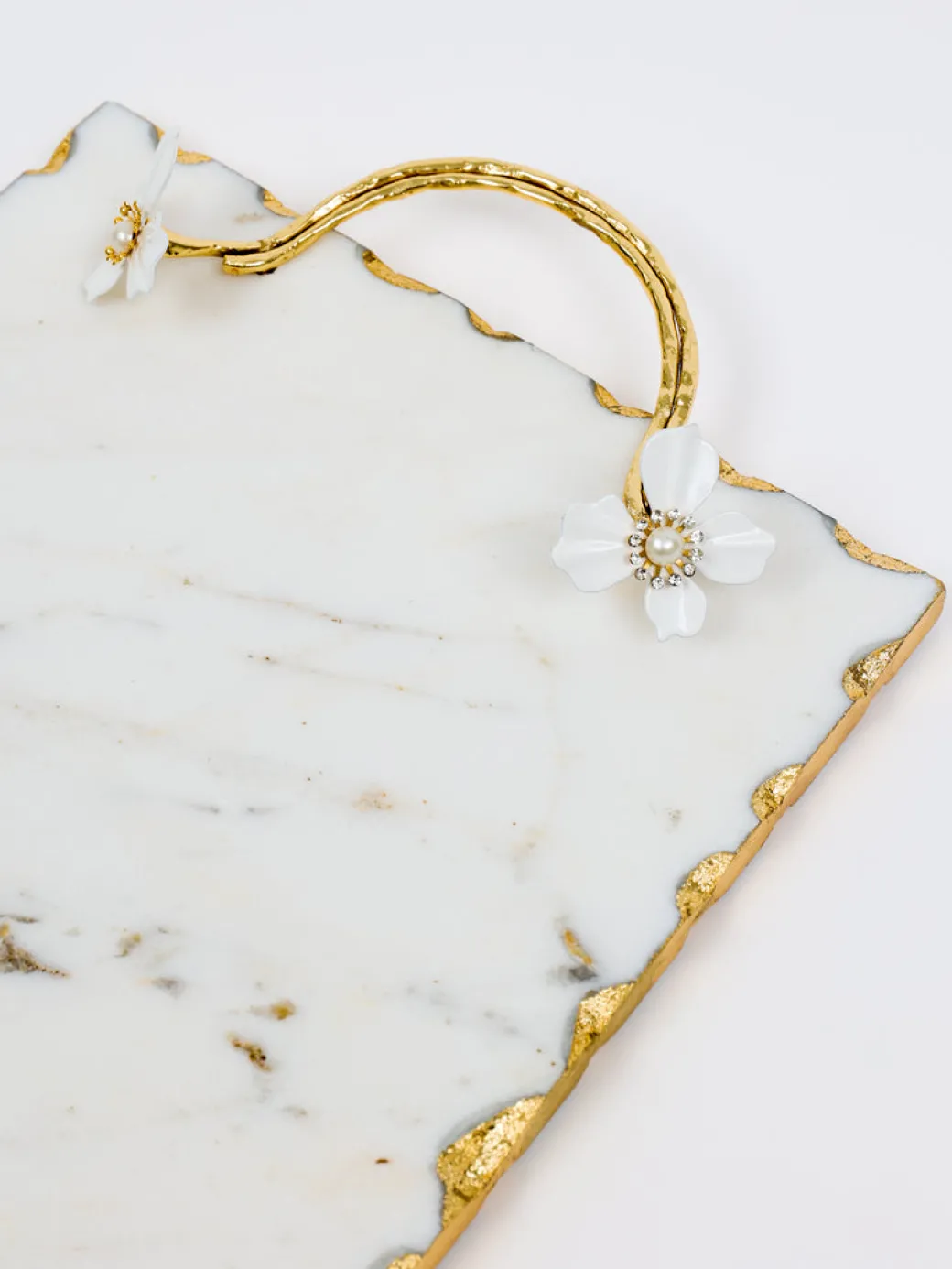 Description: This beautiful rectangular marble tray has stunning gold details with a white jeweled flower design!