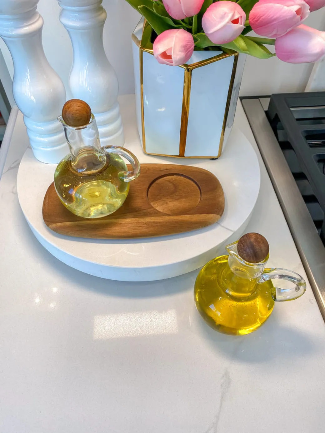 Description: Add some rustic charm to your elegant serving display! This set of 2 cruets are stationed on an acacia tray with matching acacia stoppers on the top. Ideal for serving oil and vinegar, but also able to be adapted to your favorite liquid dressings.
