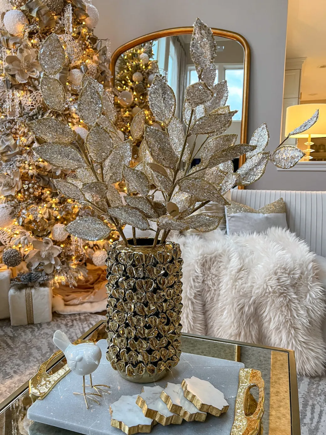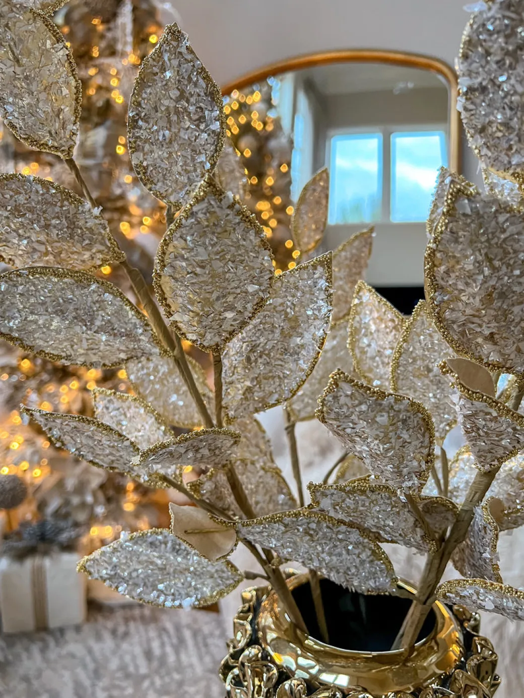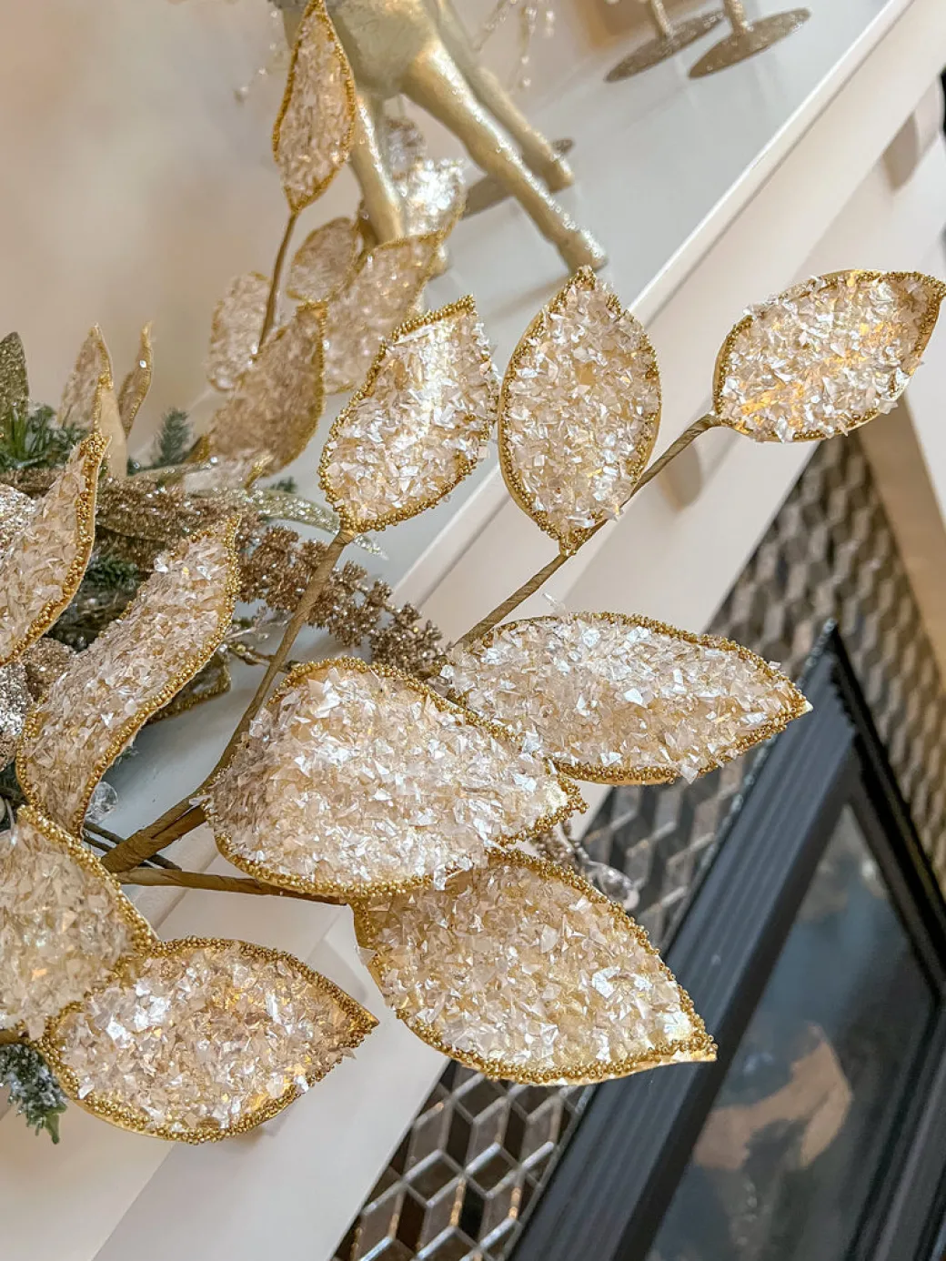 Description: This crystal glitter and beaded edge leaf spray with touches of gold and silver are just what you need to create the dazzling effect you’ve been wanting! Leaves are easy to bend to style how you desire.