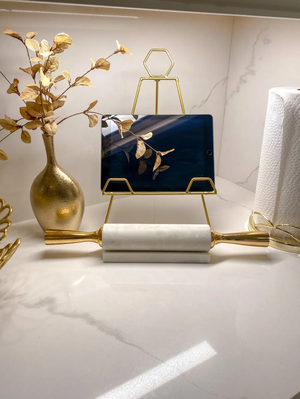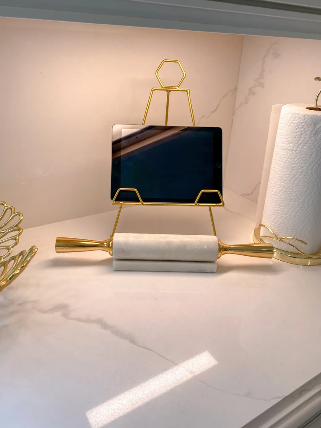 Description: Roll out your new style! Add a touch of glamorous style to your kitchen by displaying this dazzling solid marble rolling pin with its distressed golden handles and pay homage to your mothers and grandmothers.