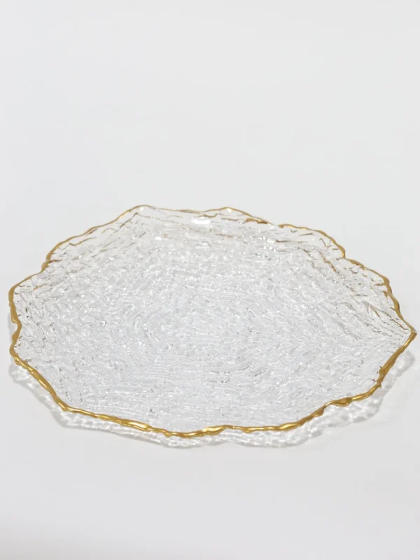 Description: This dinner plate features beautiful textured glass and a delicate gold trim to add to your serving experience! Use it to serve your favorite snacks or as a base to display for your beautiful home decor accessories!