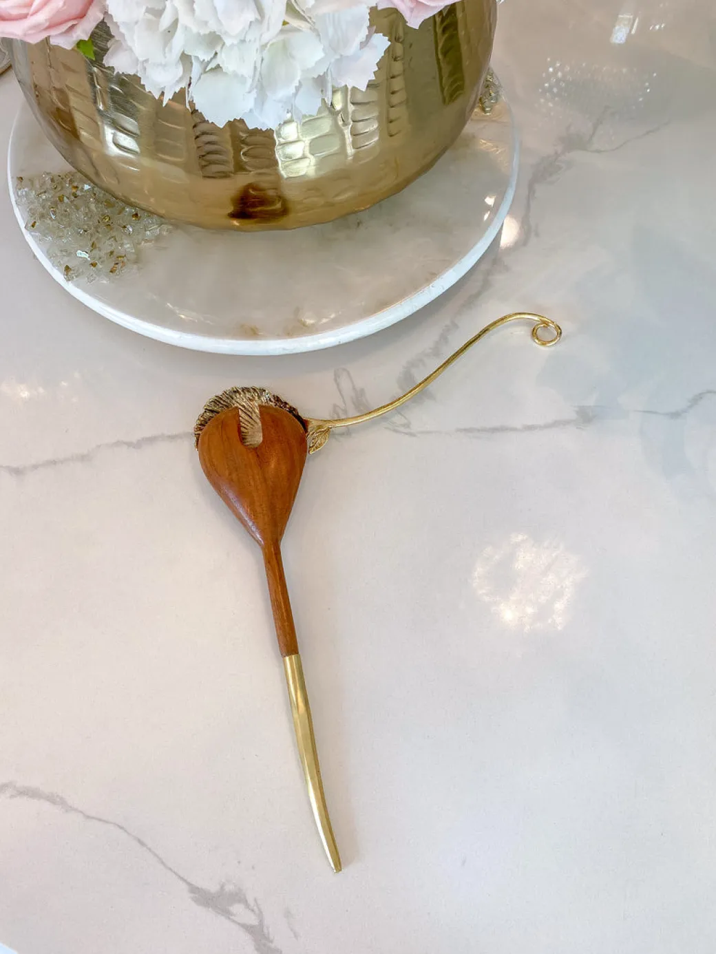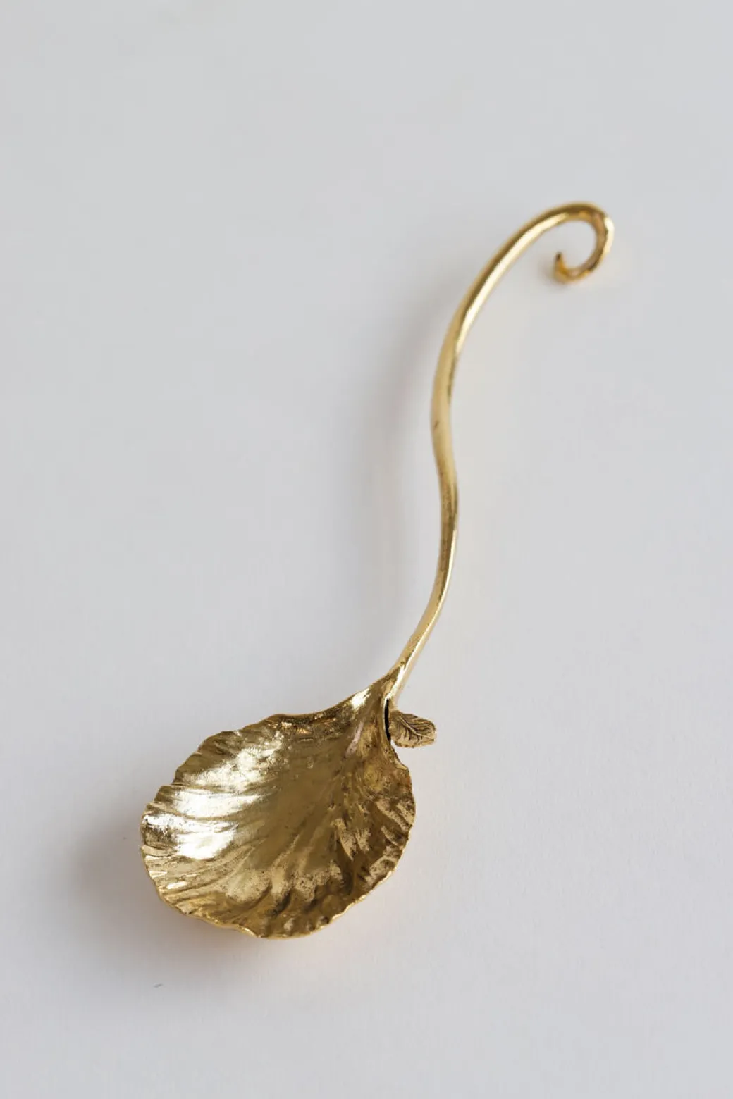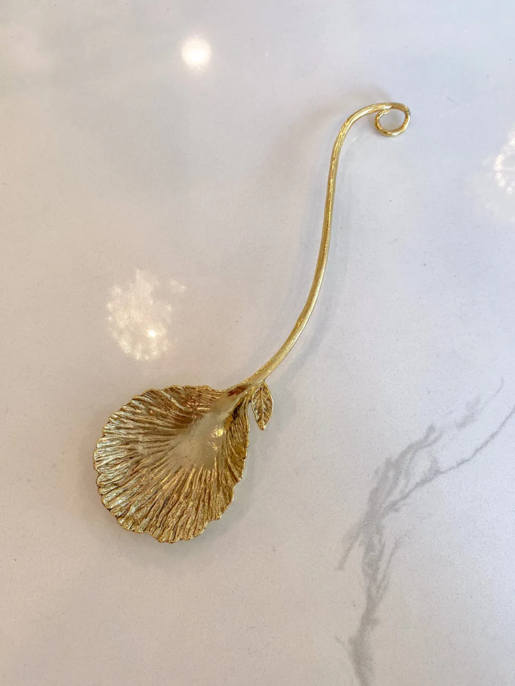 Description: Highlight any dish with this elegant spoon. This stylish organic spoon is plated in 24k gold, the end is designed as a flower petal with a small leaf poking out the side. The handle swirls upwards, making serving a dish stylish and easy!