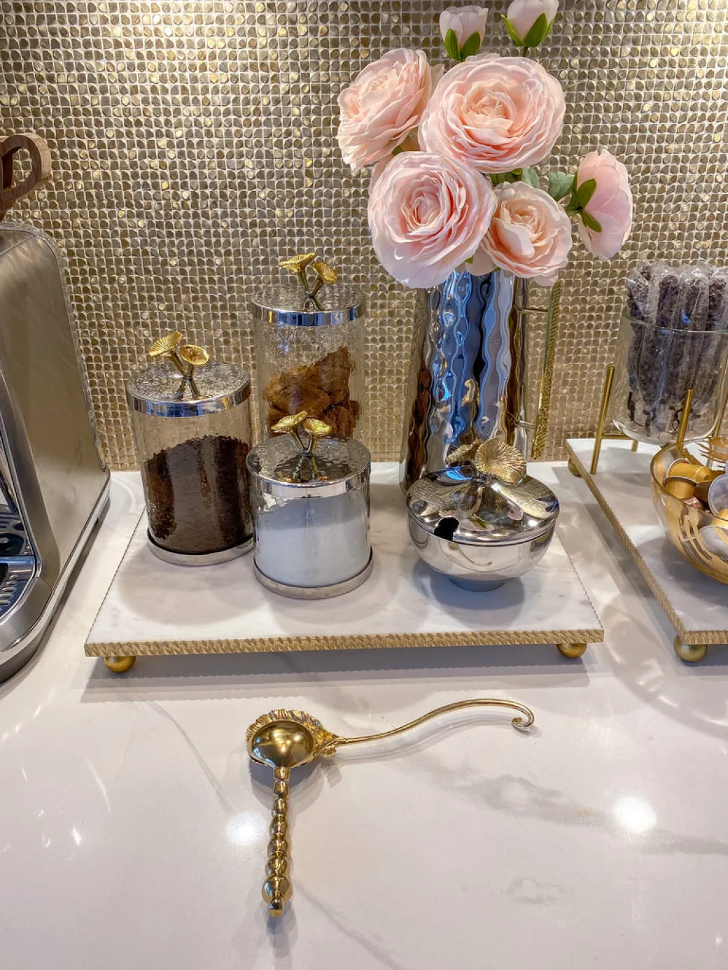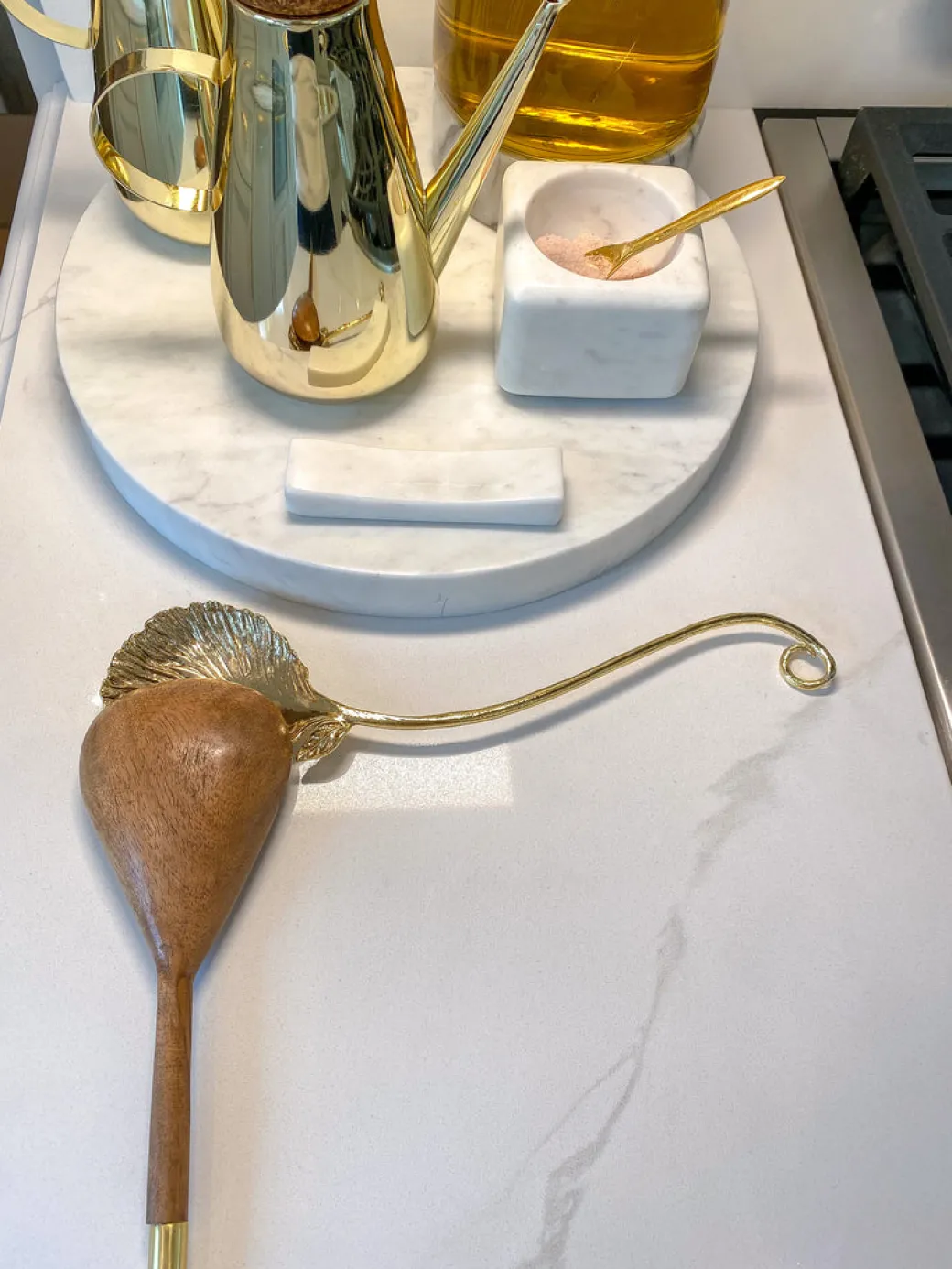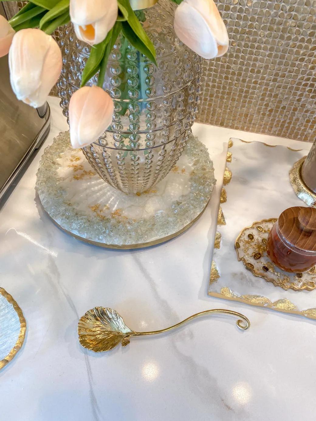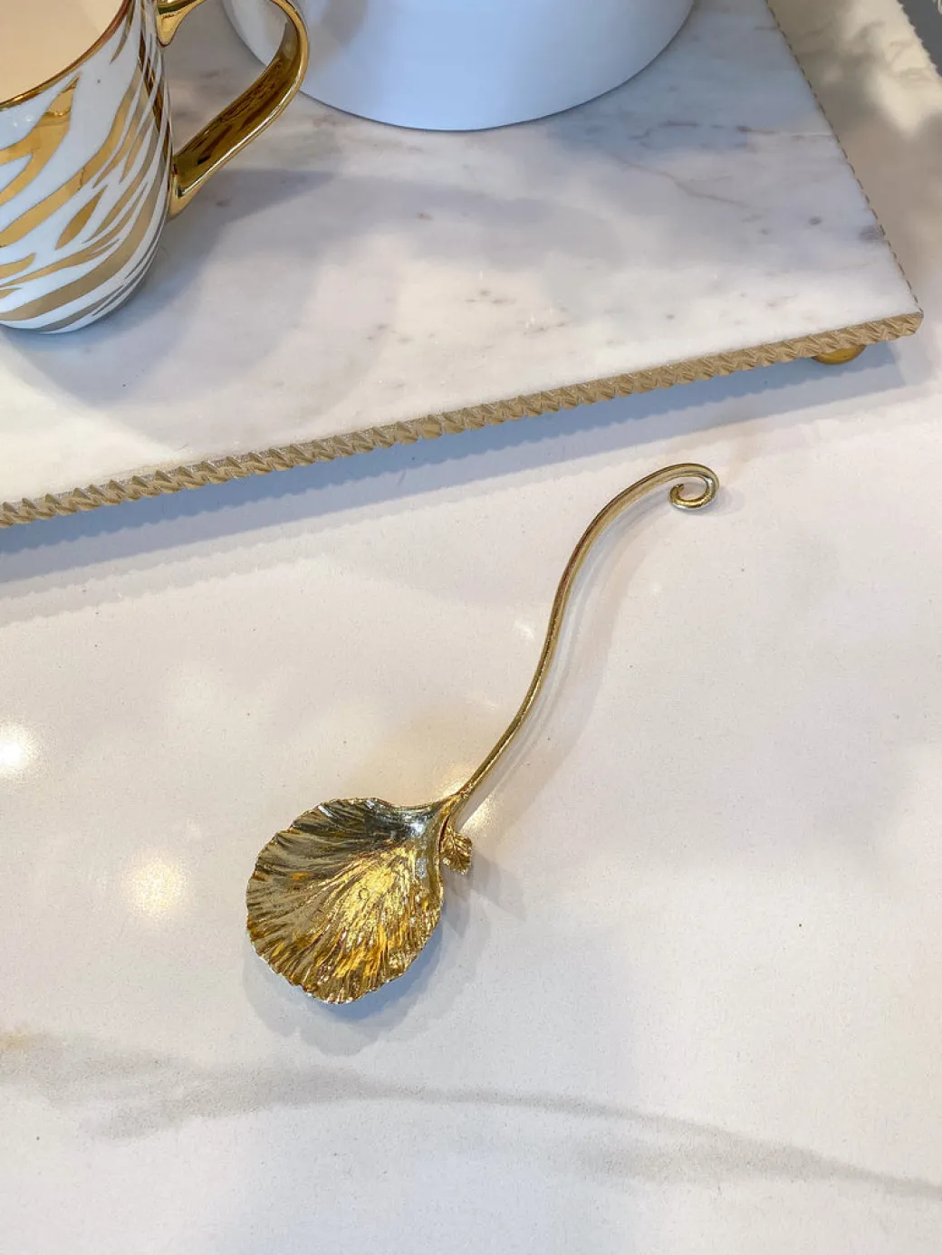 Description: Highlight any dish with this elegant spoon. This stylish organic spoon is plated in 24k gold, the end is designed as a flower petal with a small leaf poking out the side. The handle swirls upwards, making serving a dish stylish and easy!
