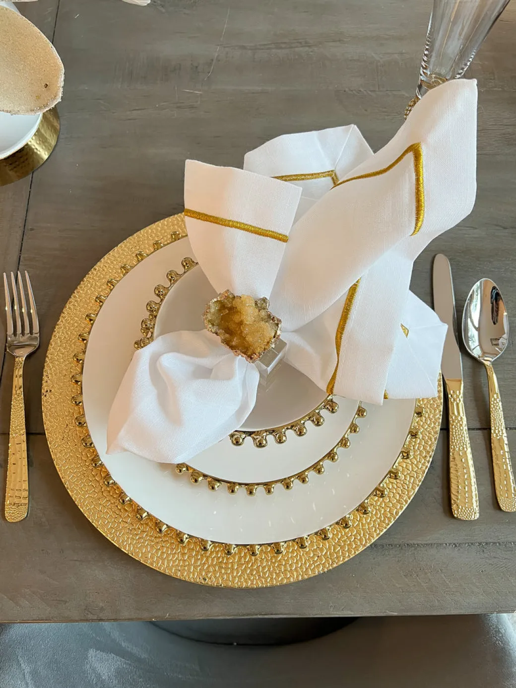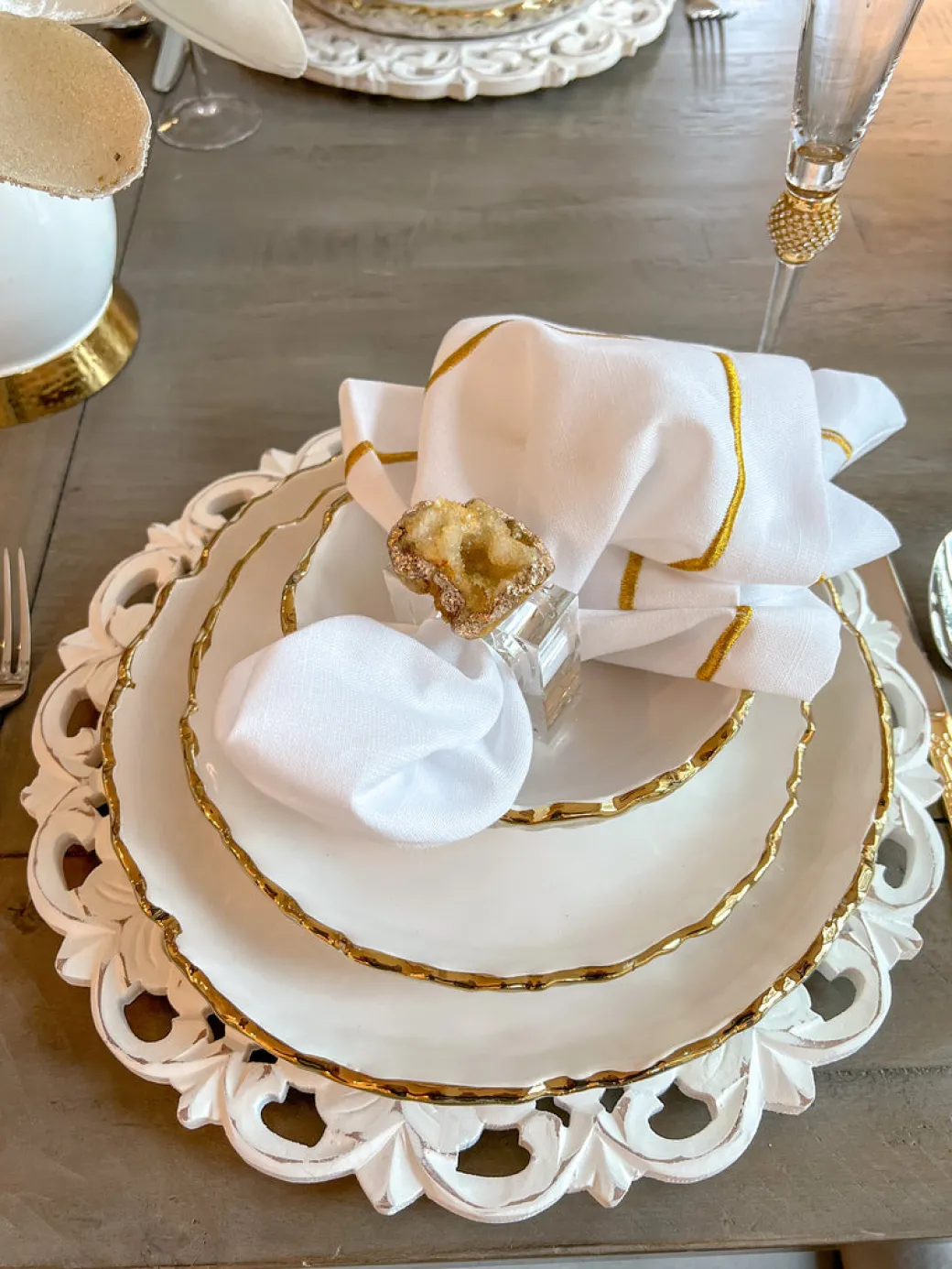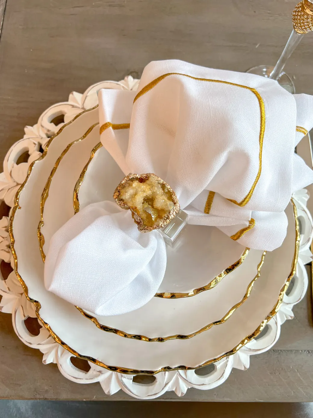 Description: Add some sparkle to your table with these gorgeous acrylic napkin rings with a golden geode floating on top. These will definantly make a statement!