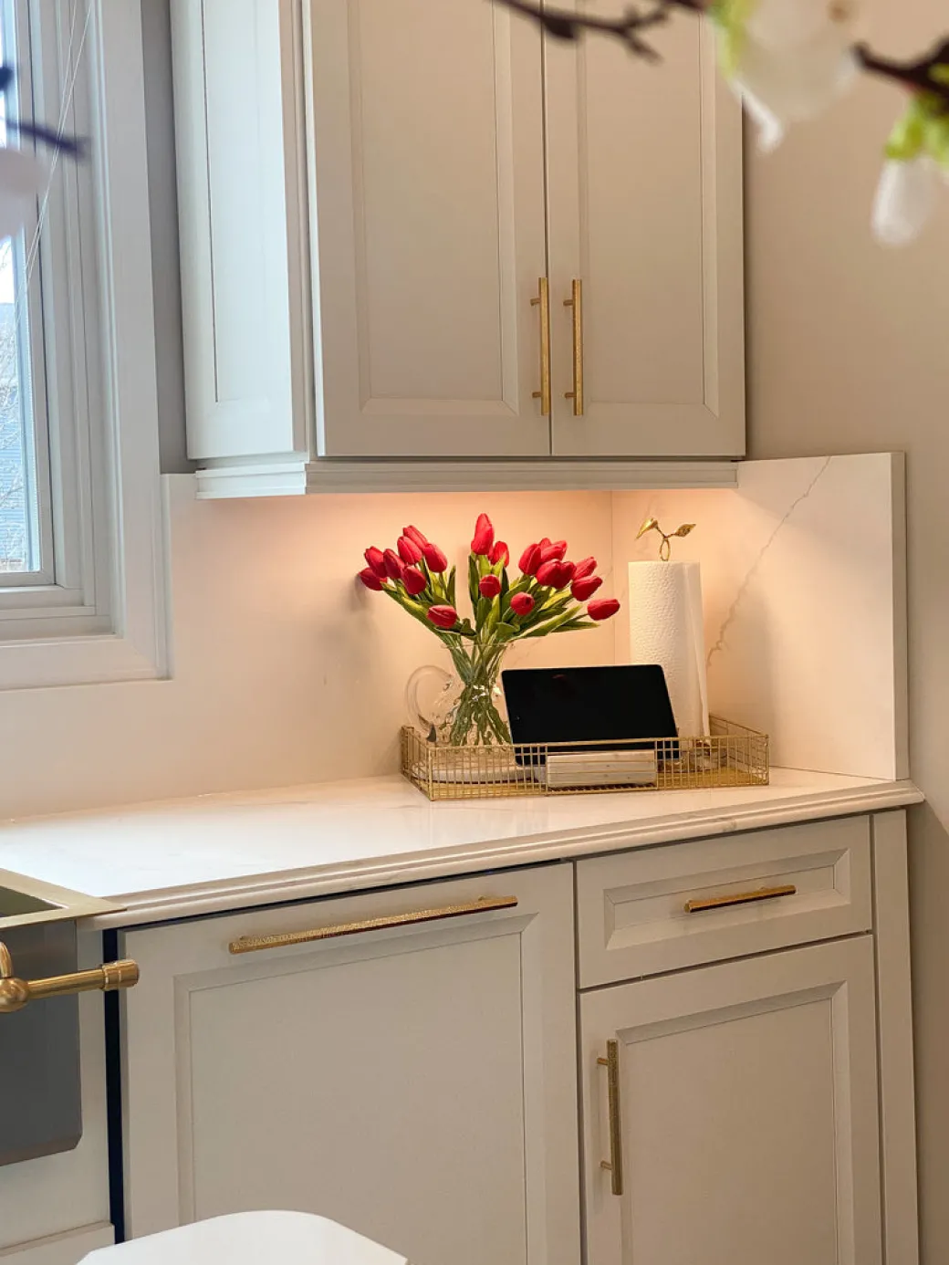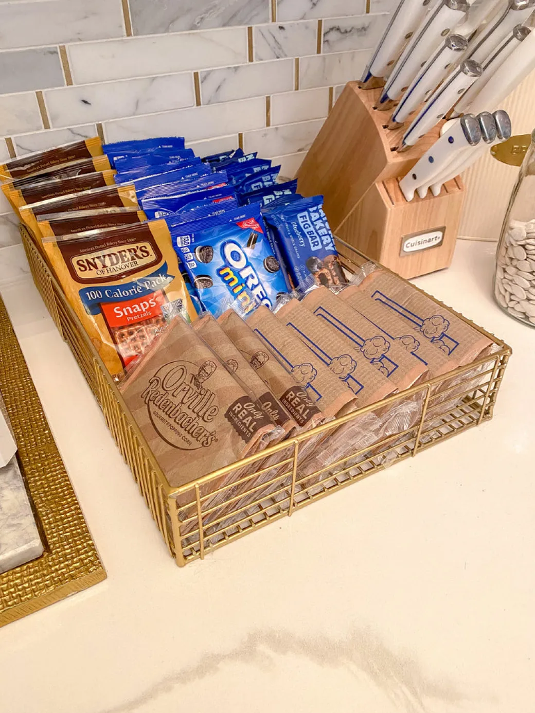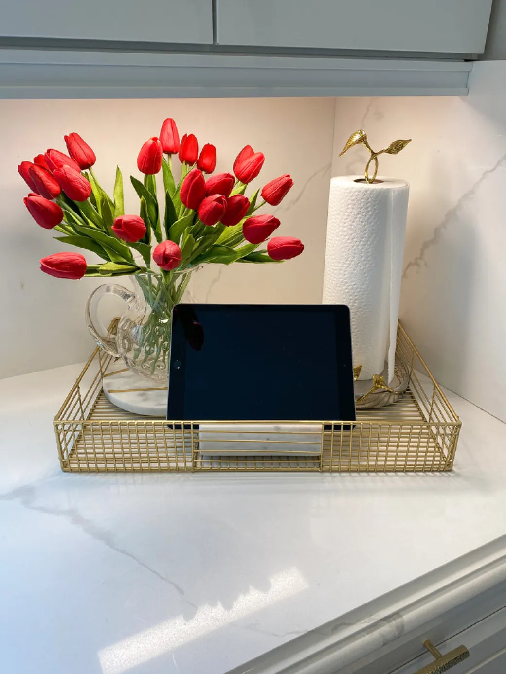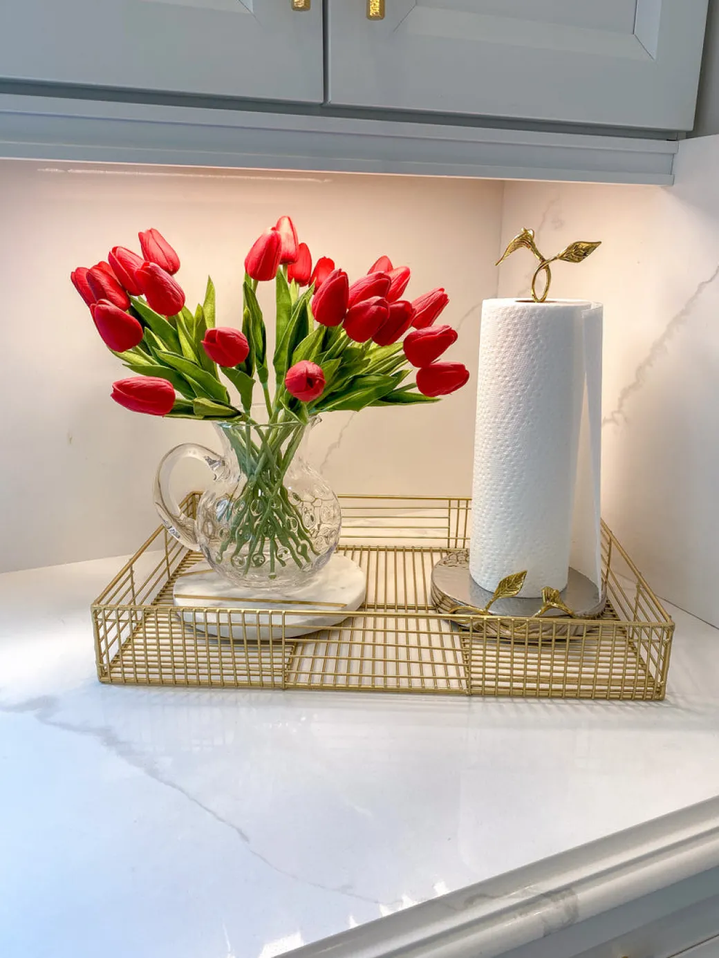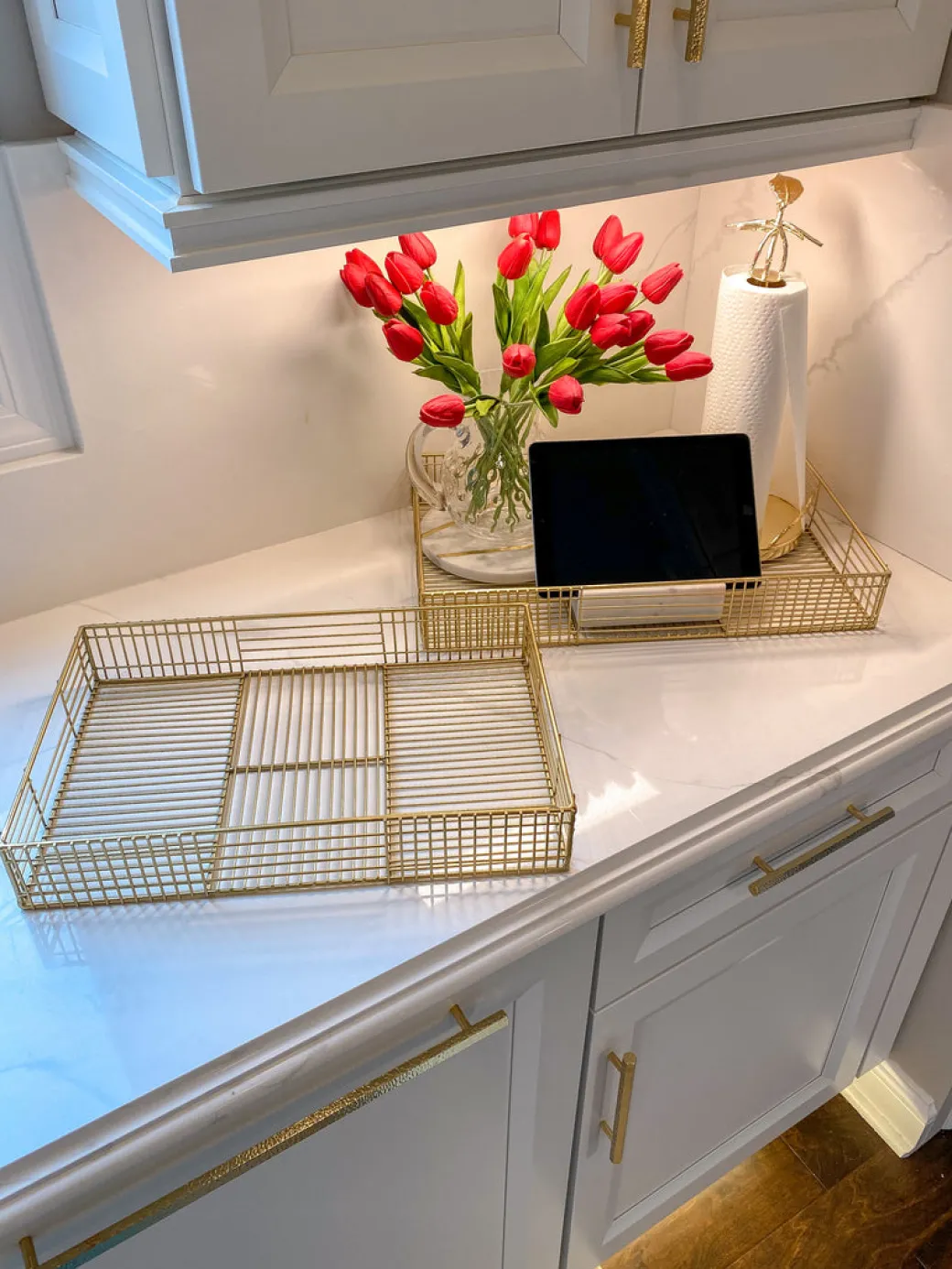Description: This set of two metal basket trays are perfect for your linen closet, shelves, or restroom organization. We love that it has a glam look while still being functional!