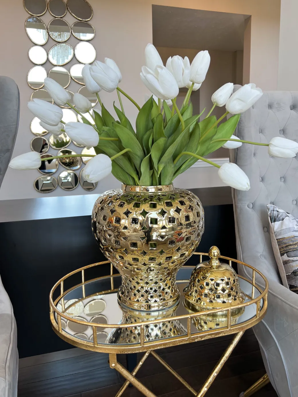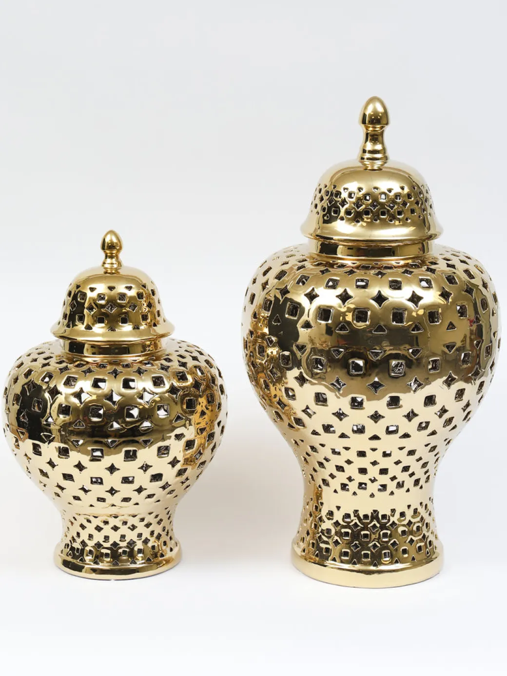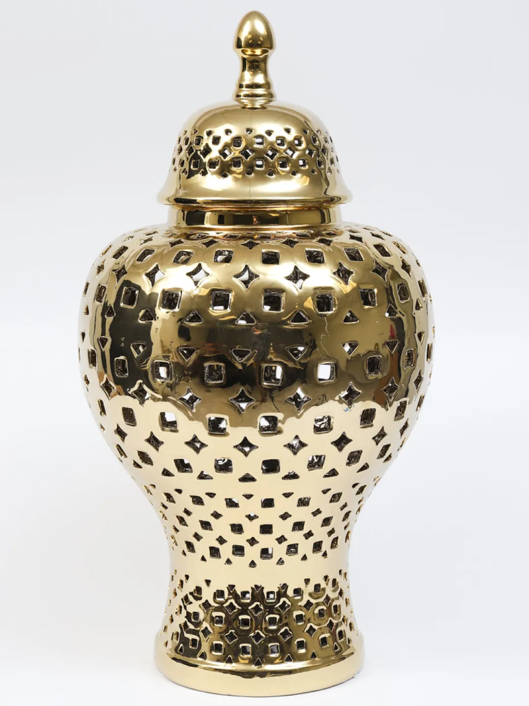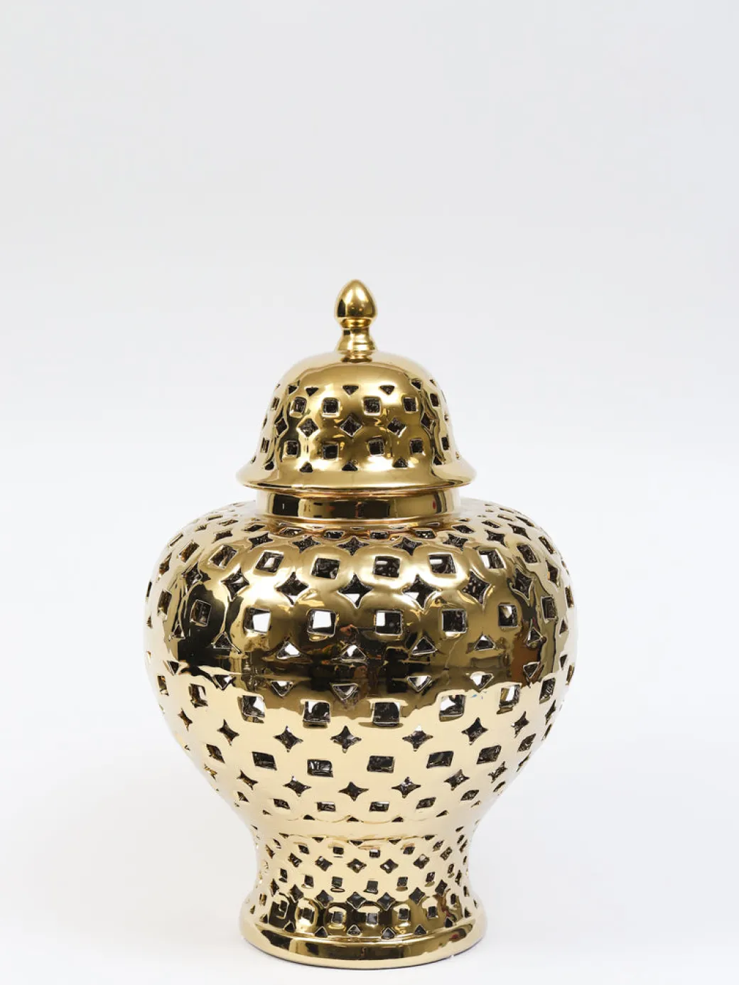 Description: This Gold pierced ginger jar will make a great addition to your home decor! Displayed with your favorite florals or on its own, either way, this piece will make a dynamic centerpiece!