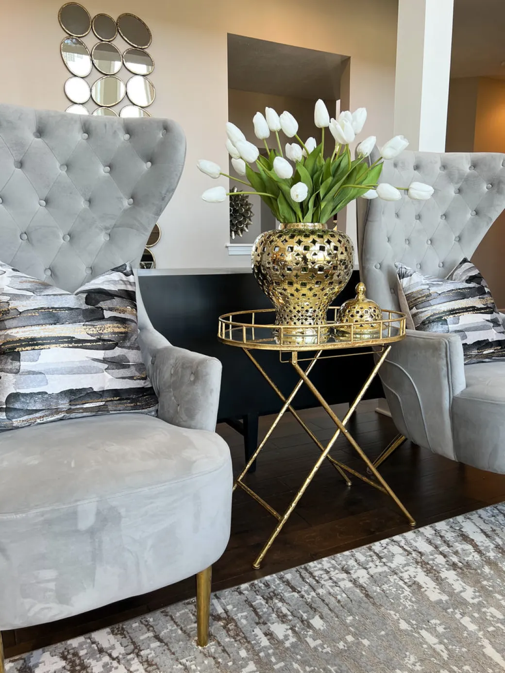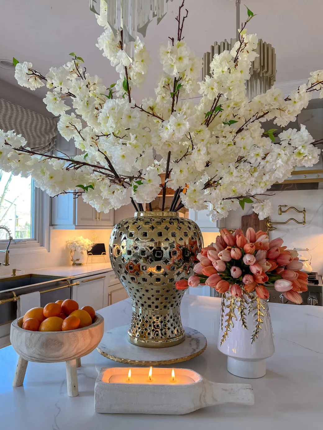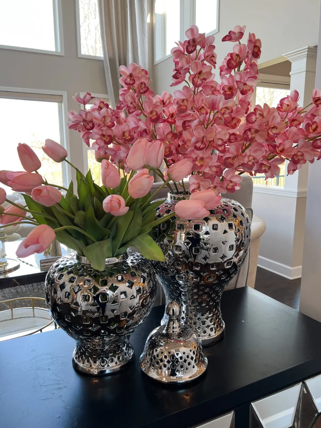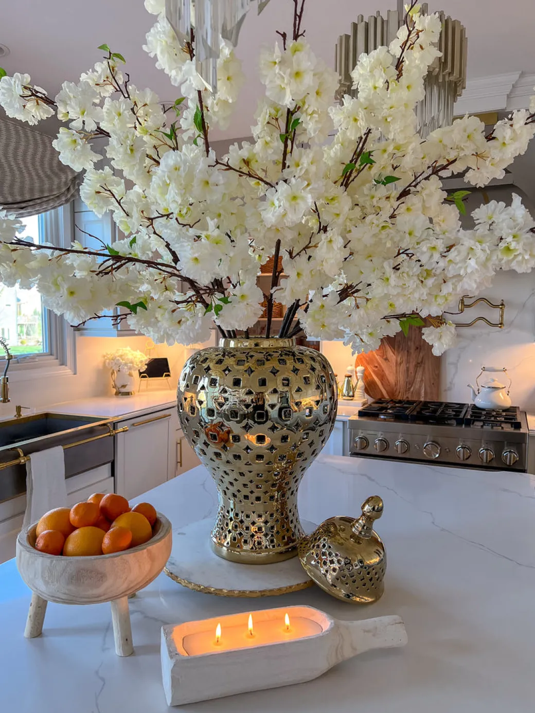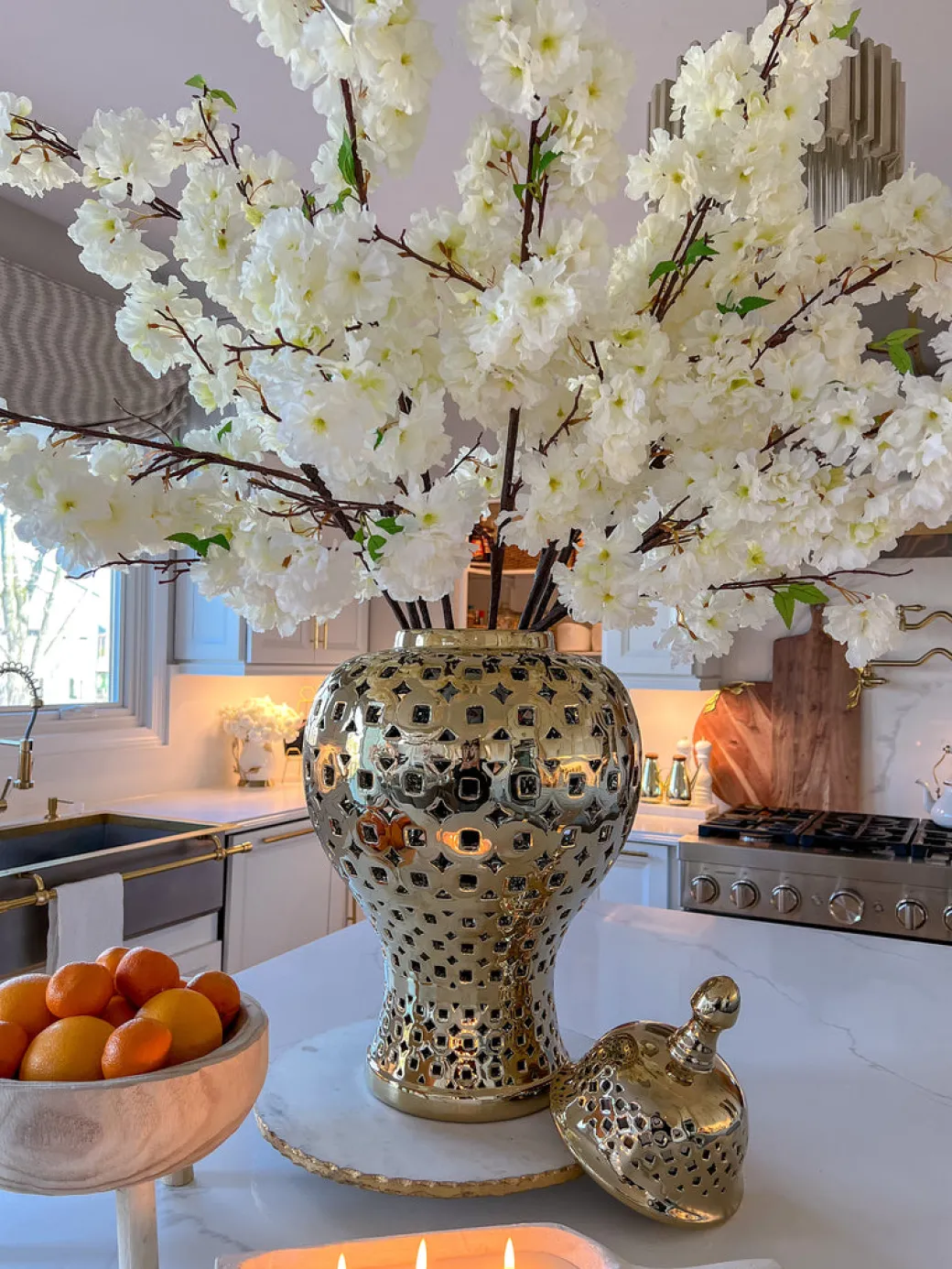 Description: This Gold pierced ginger jar will make a great addition to your home decor! Displayed with your favorite florals or on its own, either way, this piece will make a dynamic centerpiece!