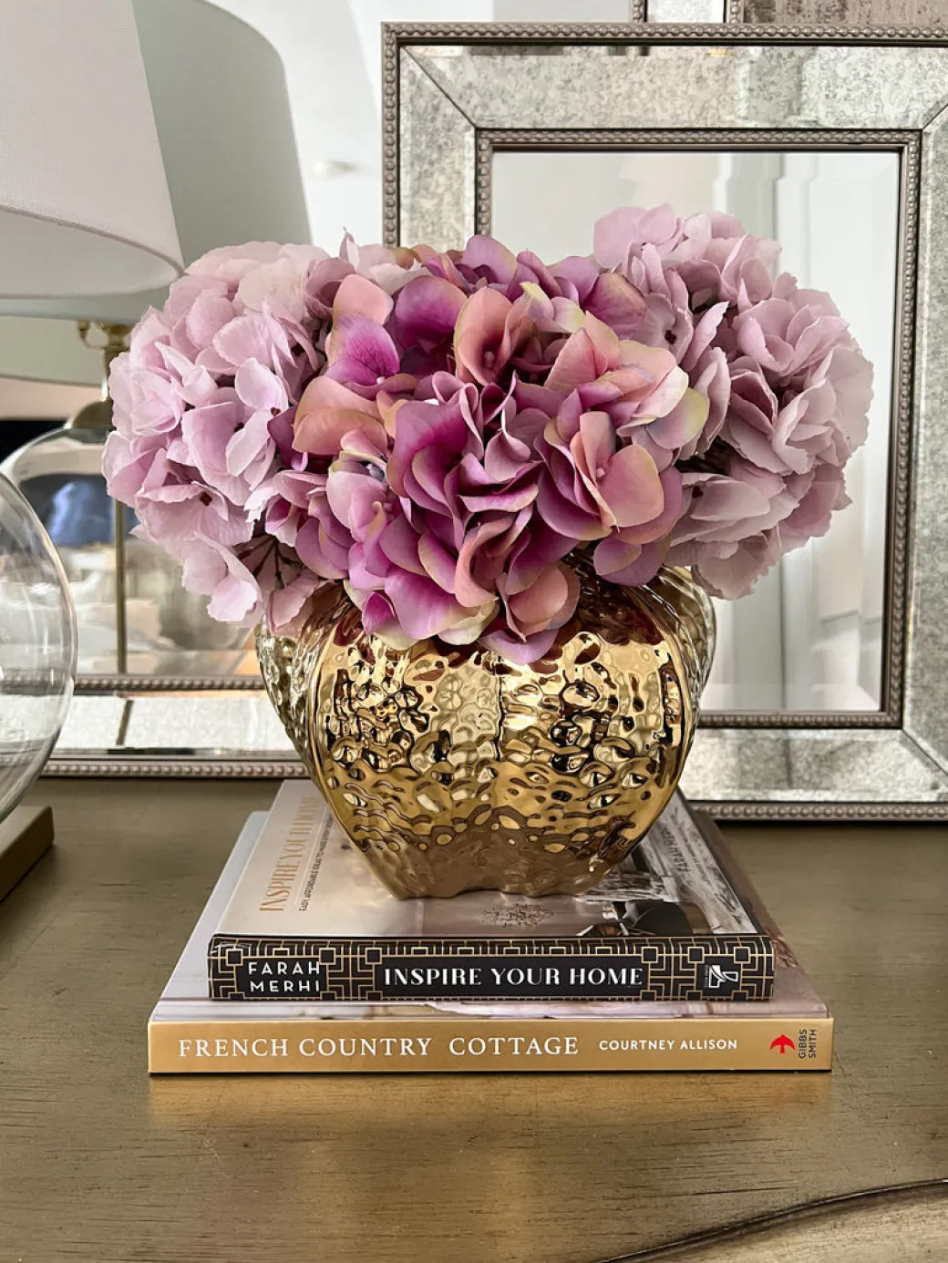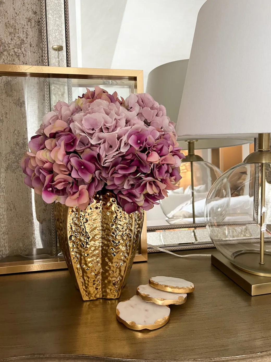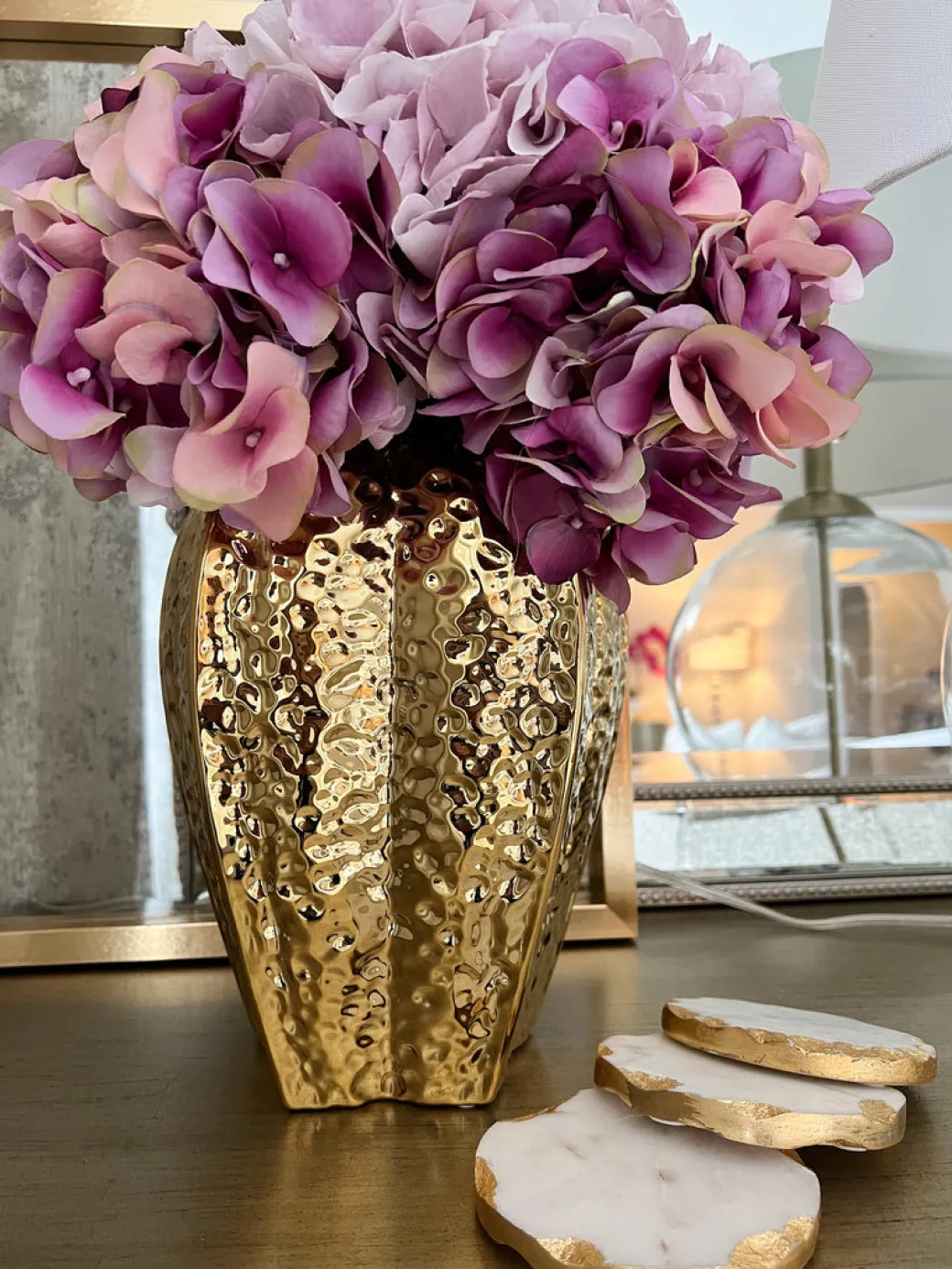 Description: These stunning gold vases are a fun shape and look so beautiful with your favorite faux florals!