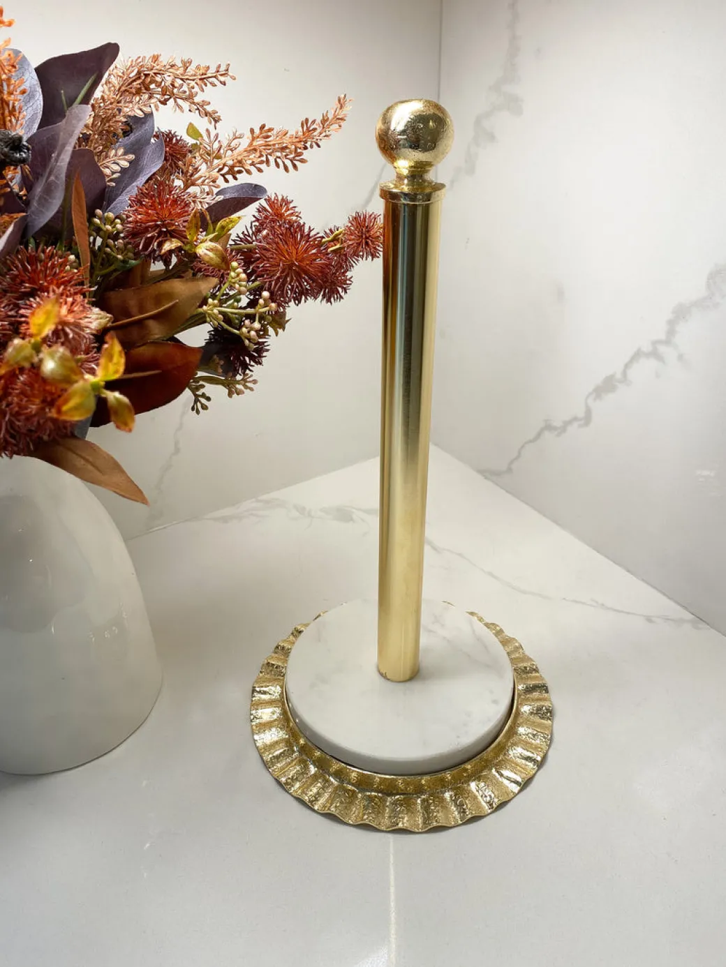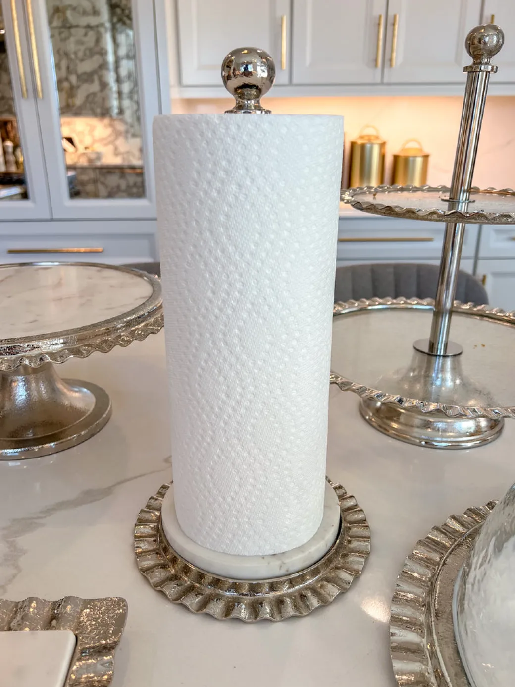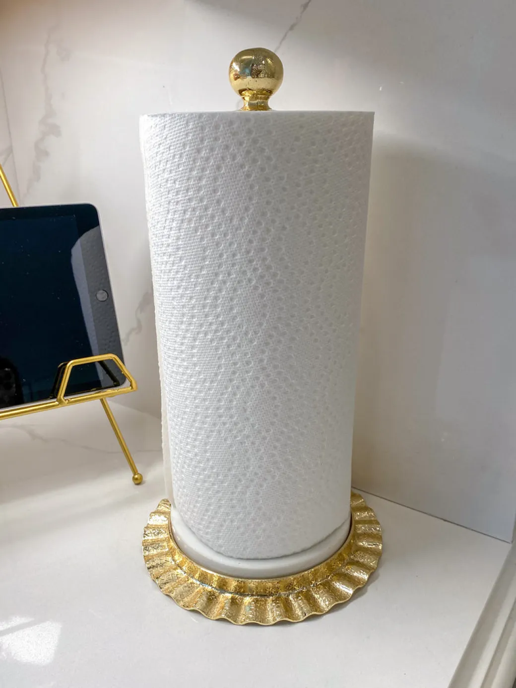 Description: Add some glam to your kitchen with this beautiful paper towel stand! The glossy finish looking dazzling on the ripple textured details and the stunning marble base for adds to a n elegant and timeless design!