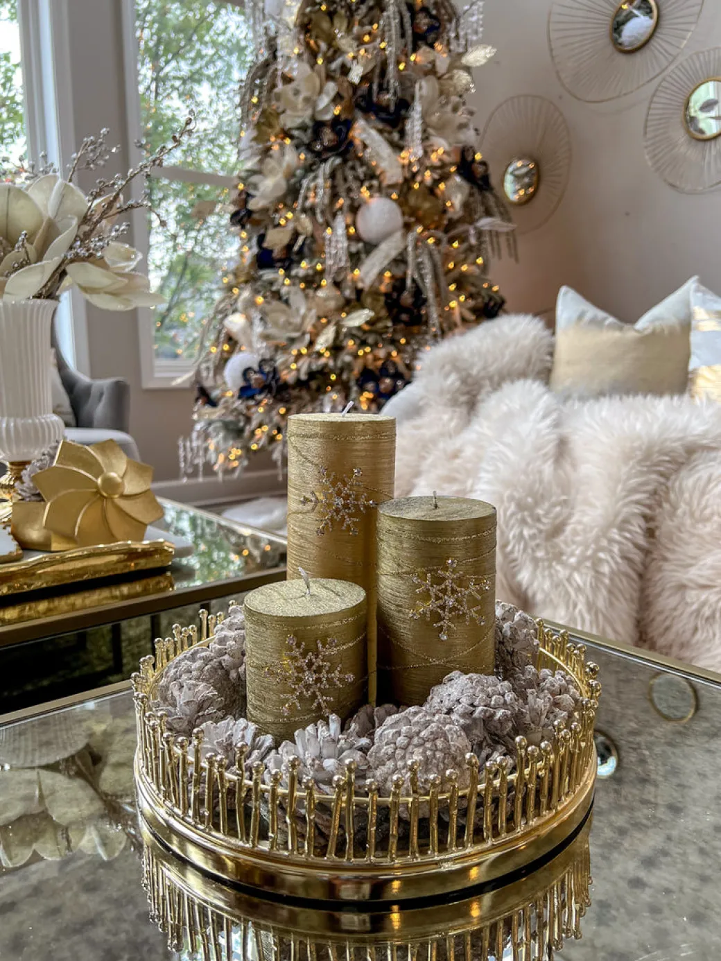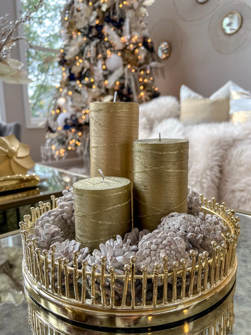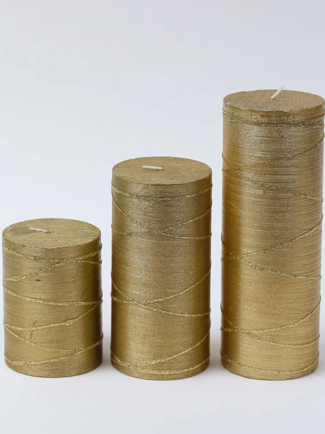 Description: These pillar candle feature a festive gold metallic finish with glitter detailing and are perfect to warm up your home and create an illuminating environment.