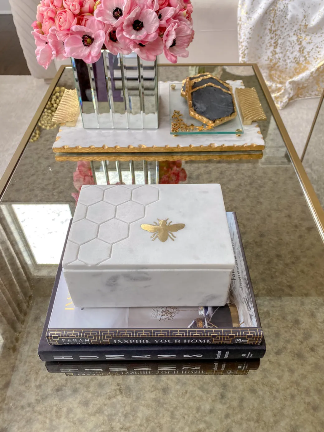 Description: This beautiful marble storage box is sweet as honey! Featuring a honeycomb detail and a small golden bee on the lid, this is a stunning and stylish piece that will enchant your home!