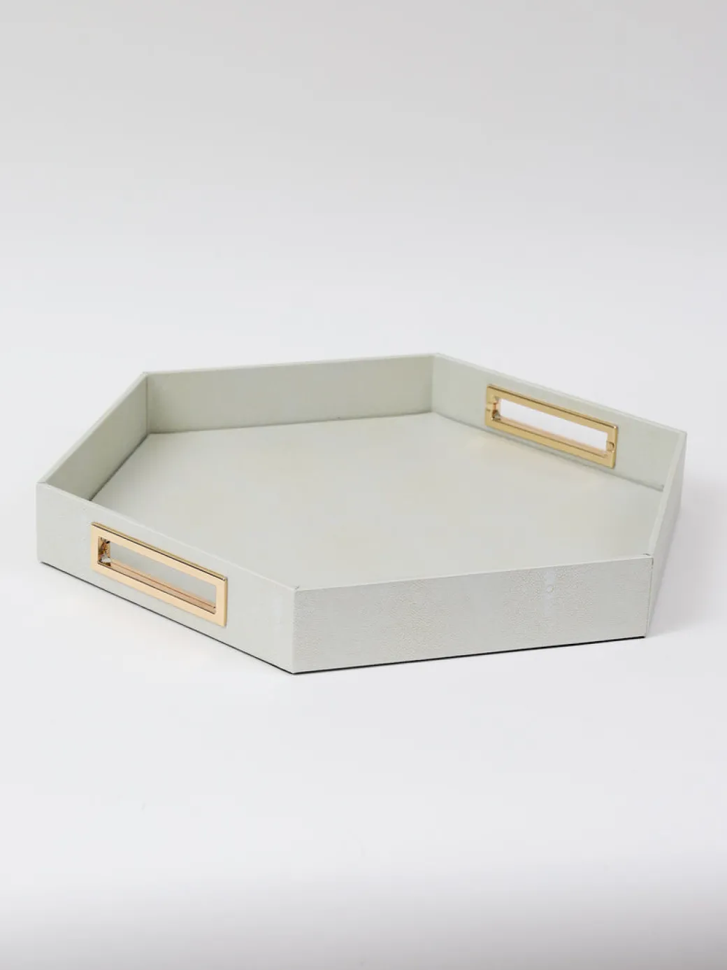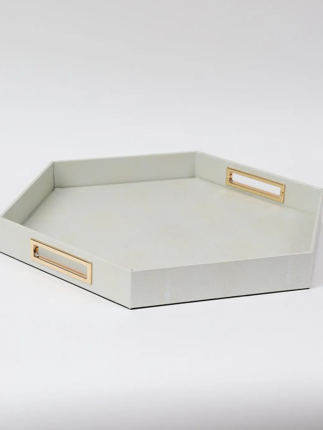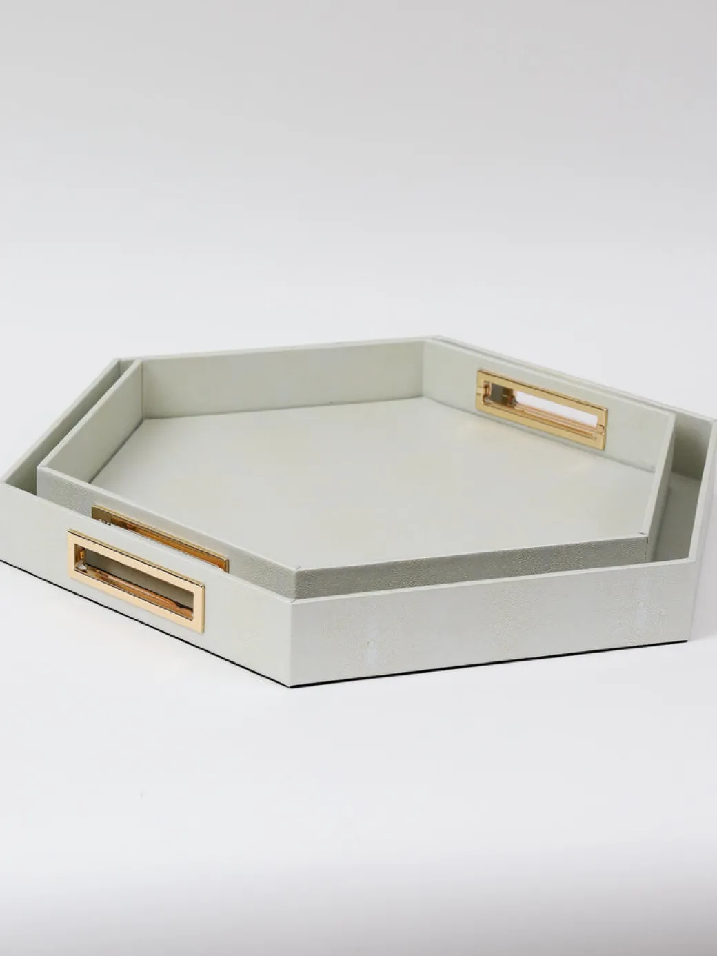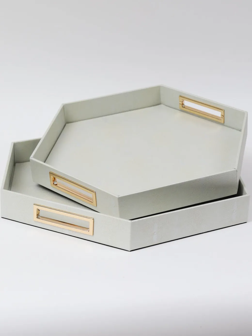 Description: These hexagon trays are so luxurious, they feature gold handle details and faux leather material.