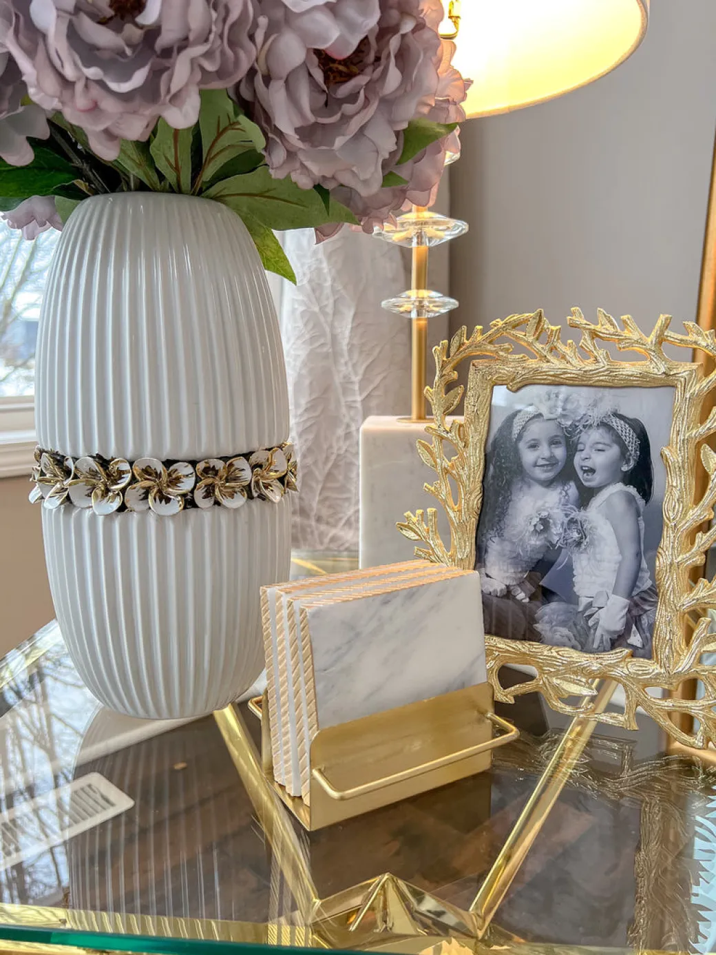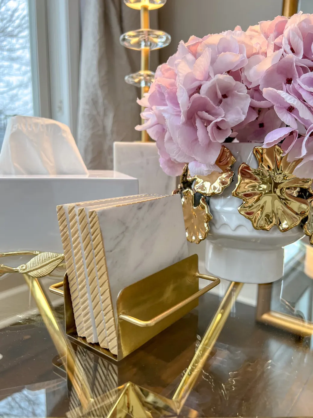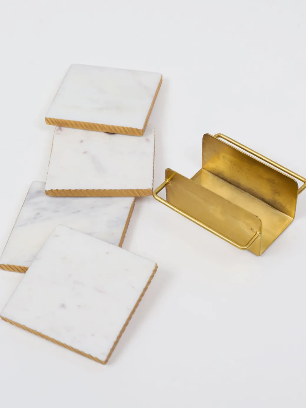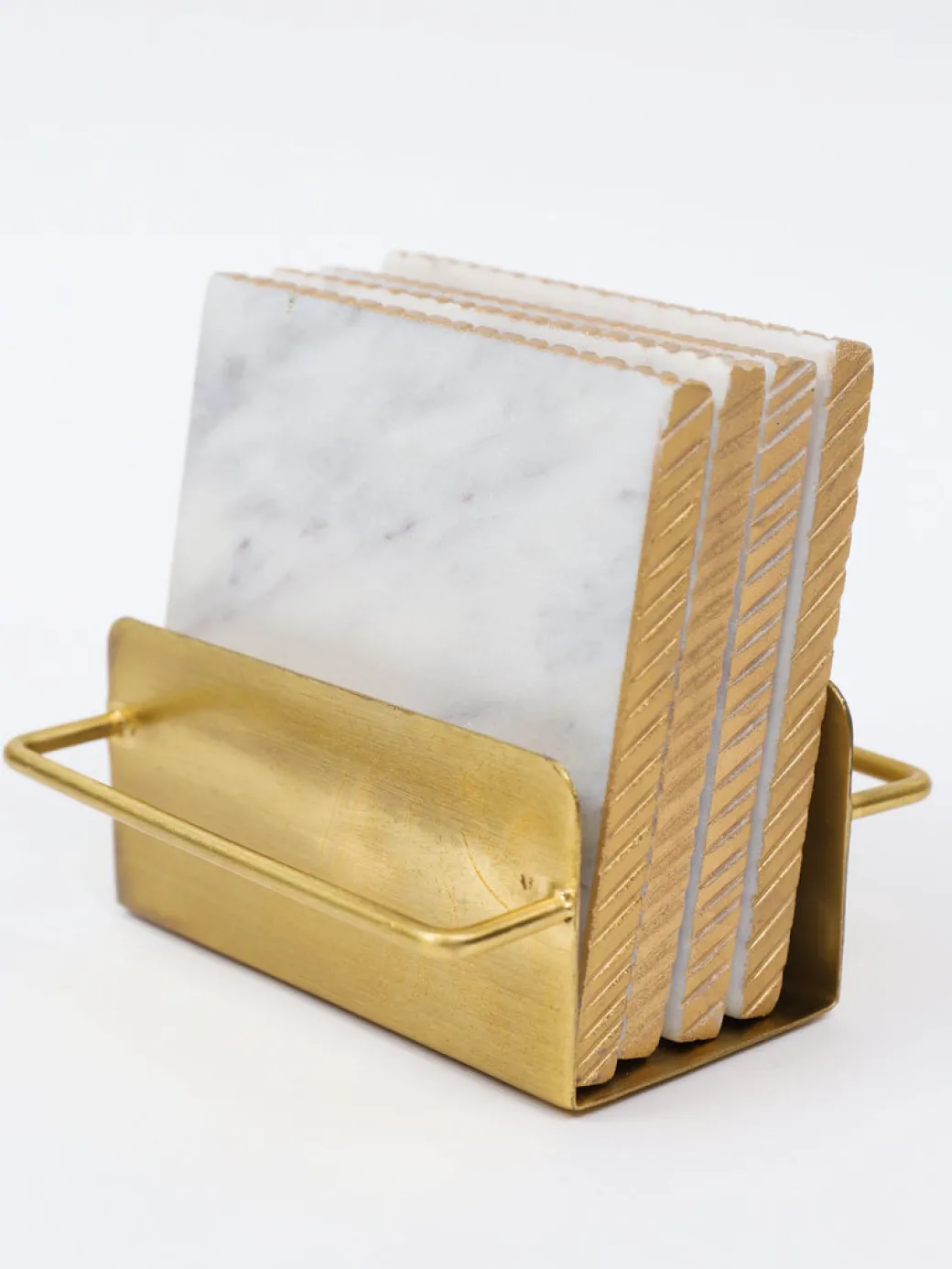 Description: These 4″ marble coasters with a gold edge with their beautiful hammered gold holder are absolutely beautiful to display on your coffee table.