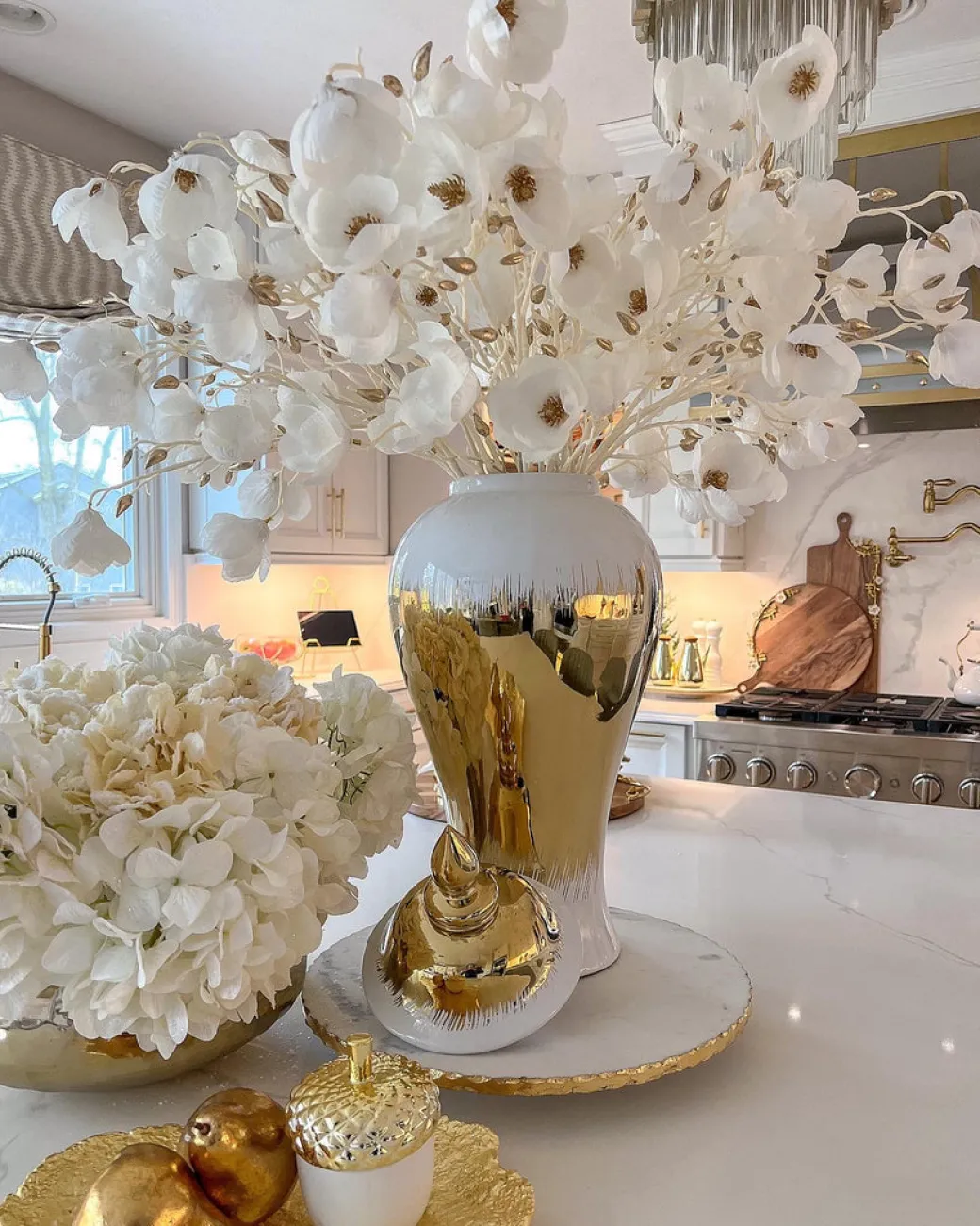 Description: This stunning white and gold stem resembles a beautiful porcelain magnolia flower. It is the perfect stem to use during the winter months, but can be styled year round!