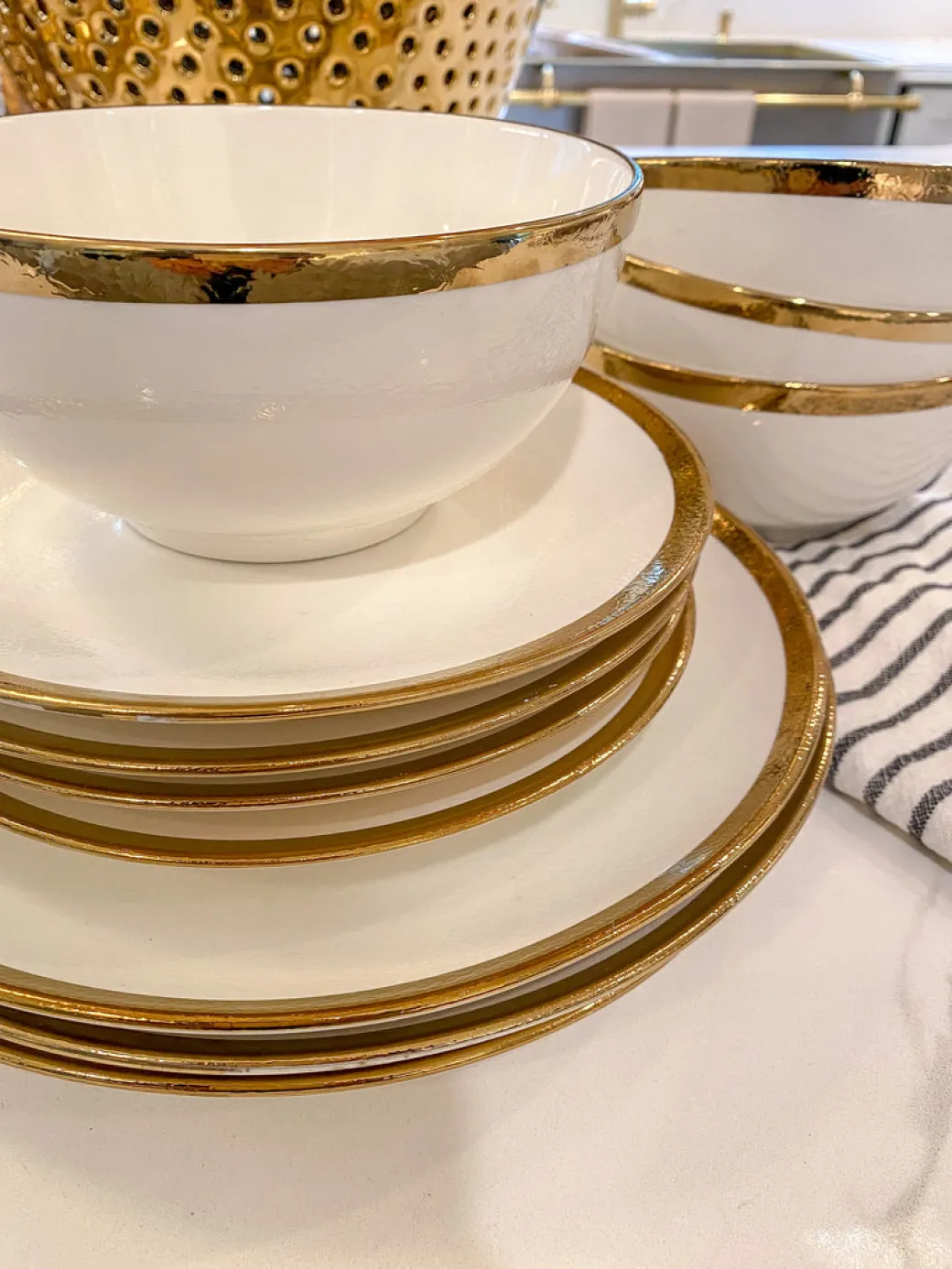 Description: This place setting set has a sleek elegance to it. Replace mismatched place settings with this dinnerware set made from white porcelain with a gold band around each piece. This set included 12 pieces total: 4 dinner plates, 4 salad plates, and 4 bowls.