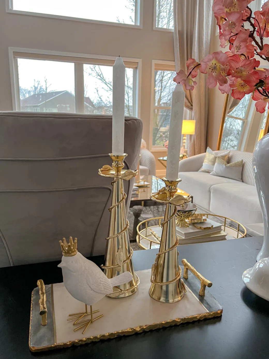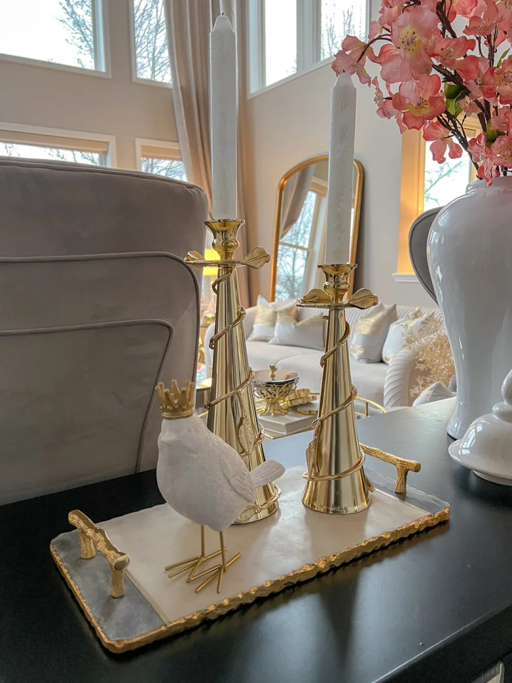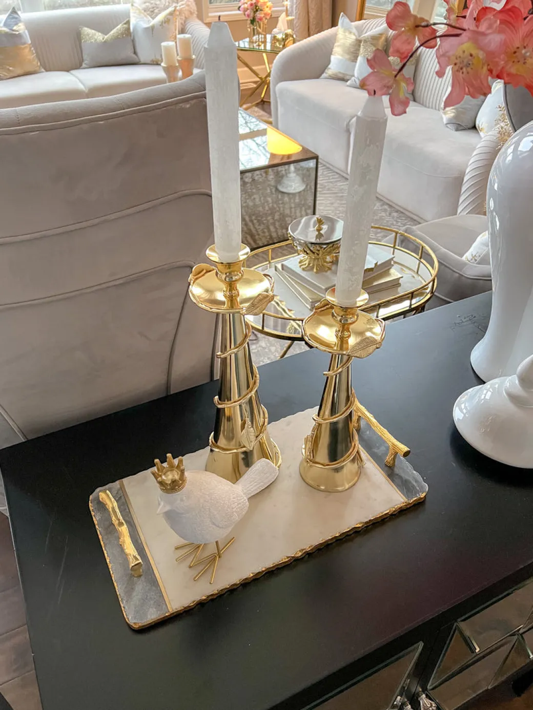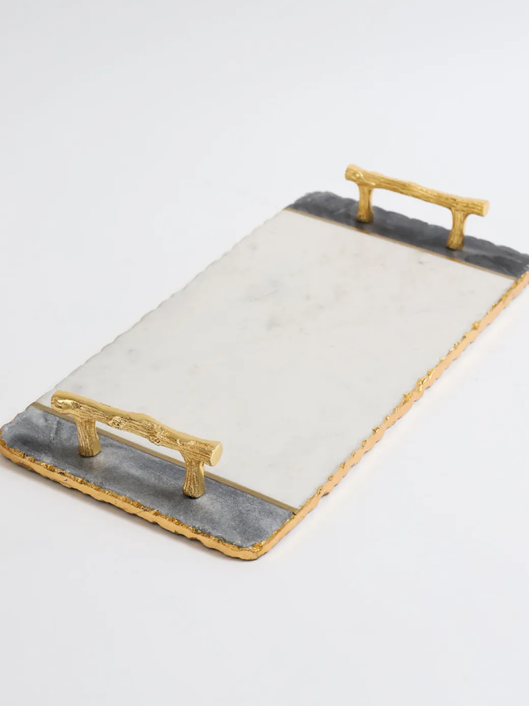 Description: This Black and White rectangle tray features gold handles and is perfect for layering with your decor or serving your favorite snacks.