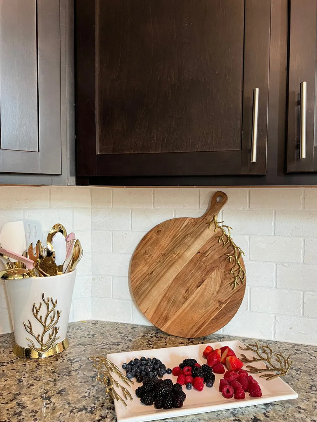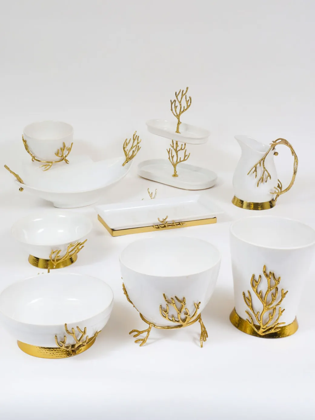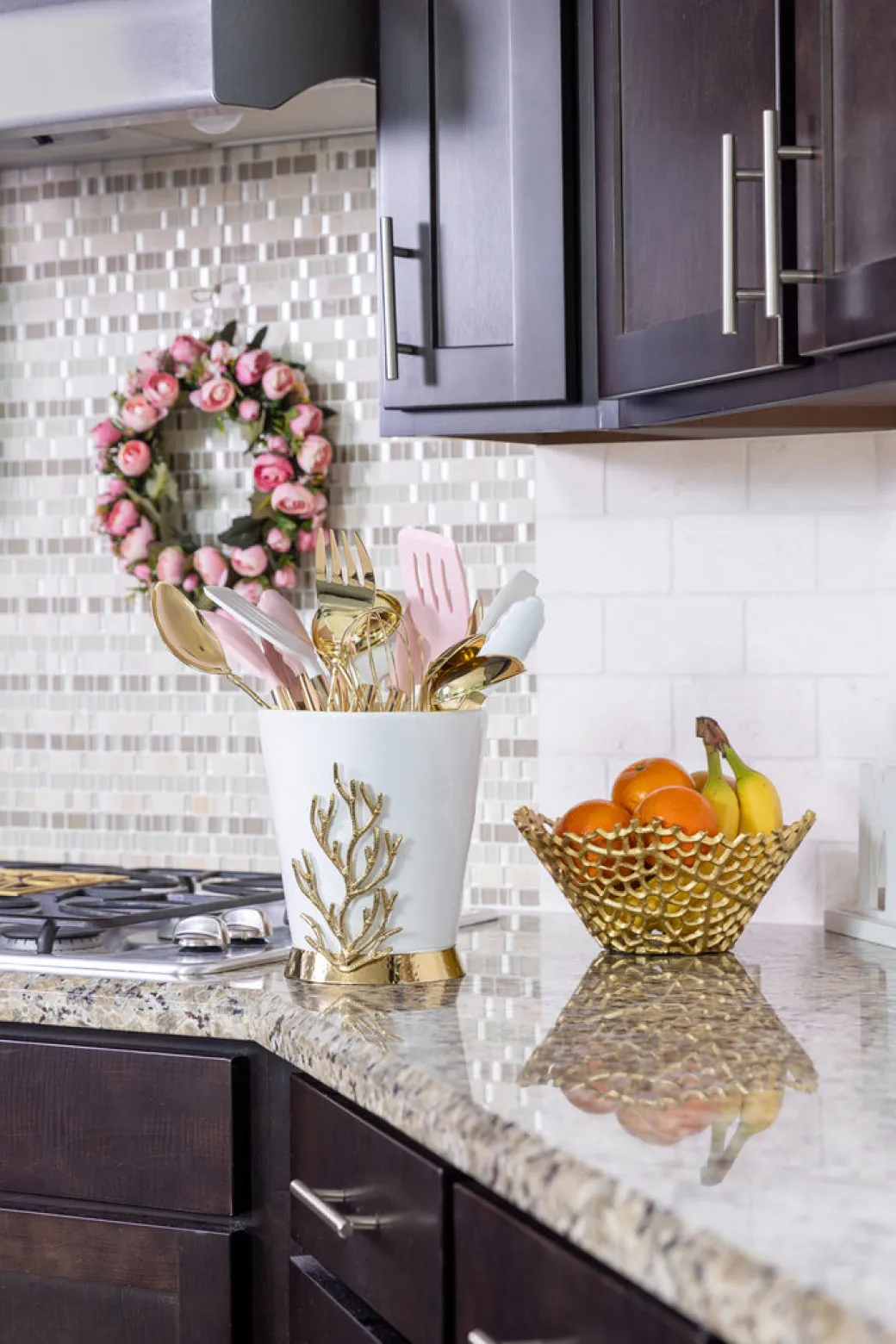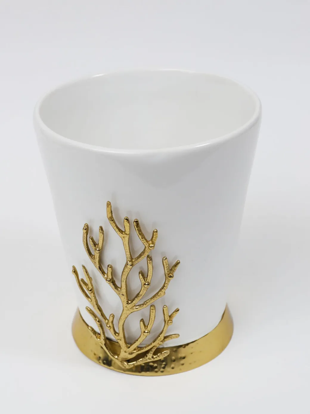 Description: This beautiful utensil holder is a great piece of elegant design and is so versatile. It makes a stunning vase or wine bucket. The gold textured details complement the glossy white ceramic to create a timeless sheer elegance and glam.