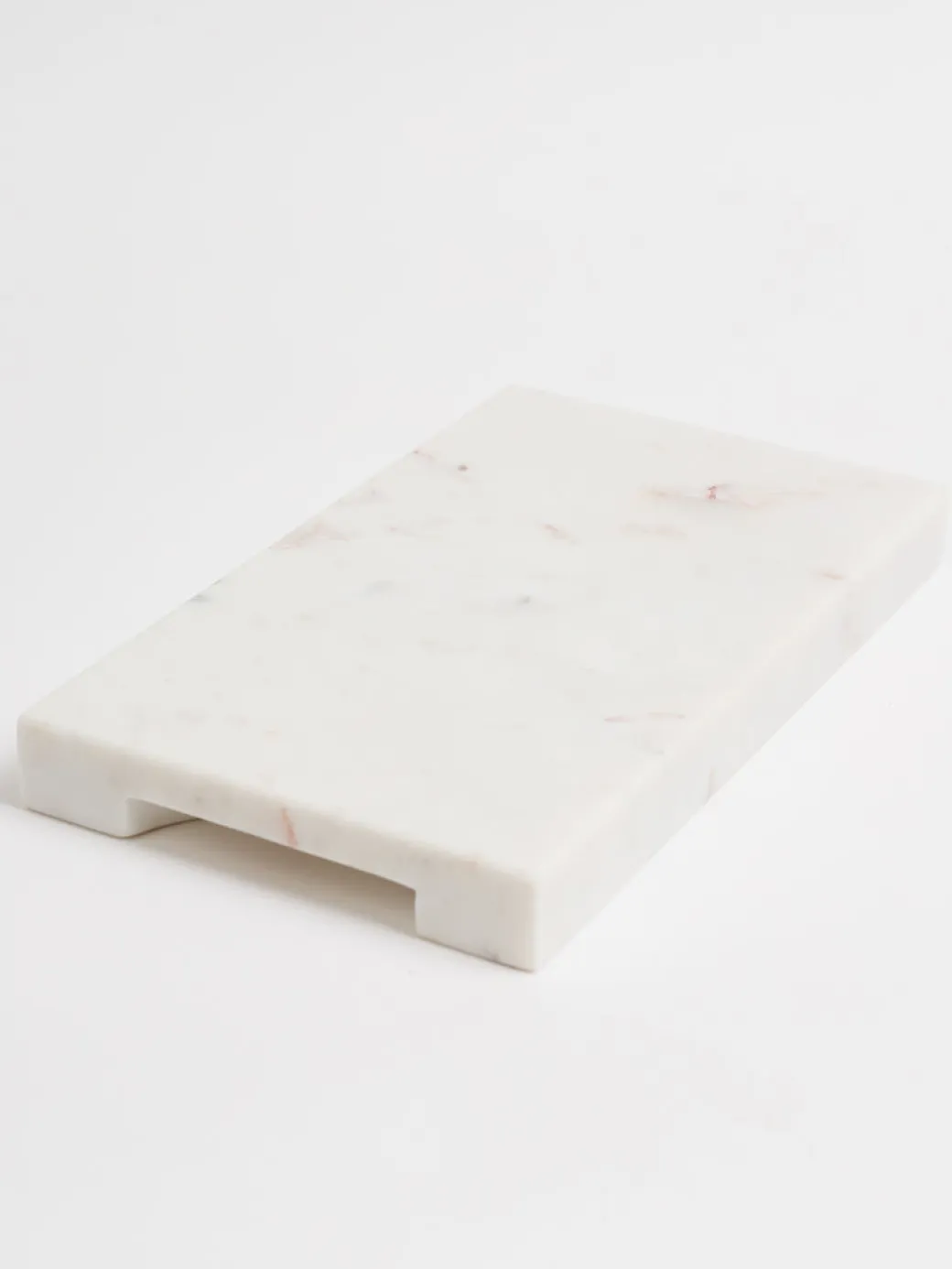 Description: This gorgeous white marble board is handcrafted and each piece will contain natural tonal striations and color variations making it truly one of a kind.