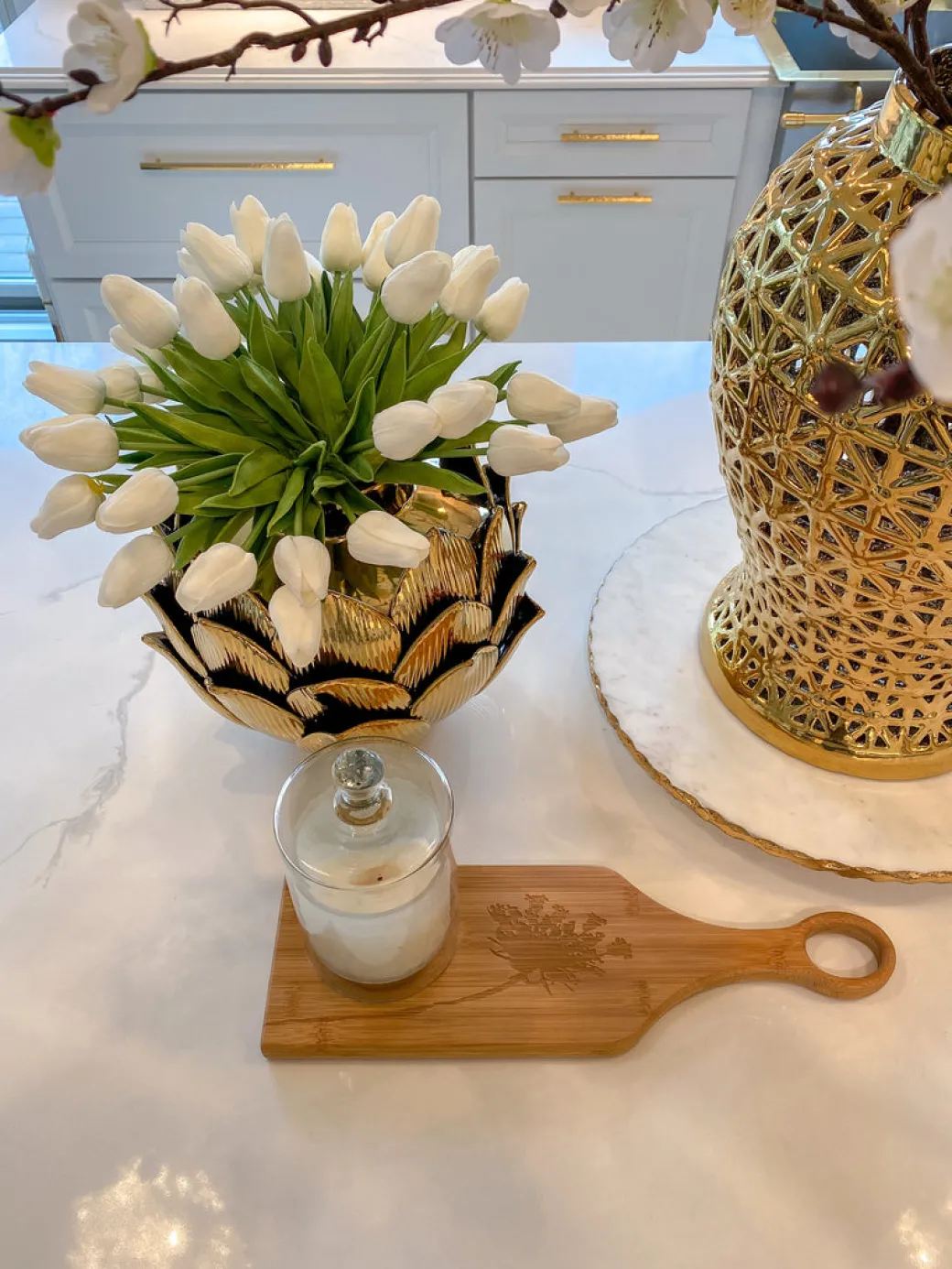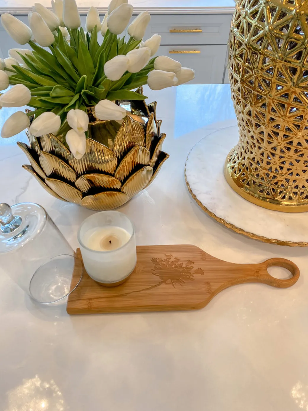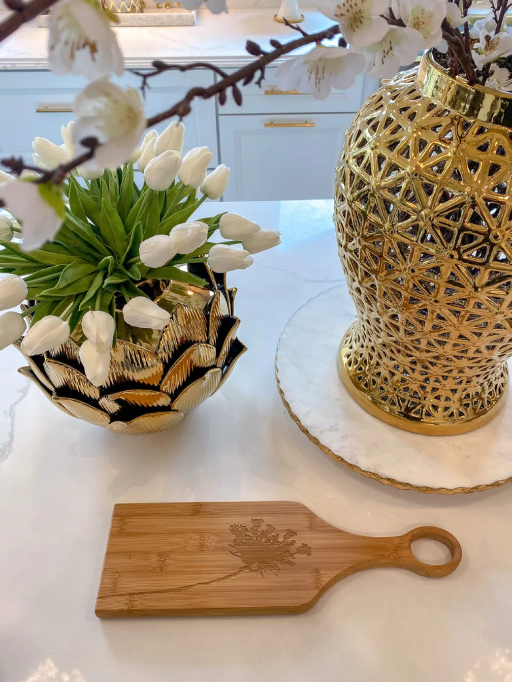 Description: This rectangle bamboo board is a fun layering piece! Stand it up and layer it with other boards, or set it down and put your favorite candle on it! We love the fun wild flower carvings.
